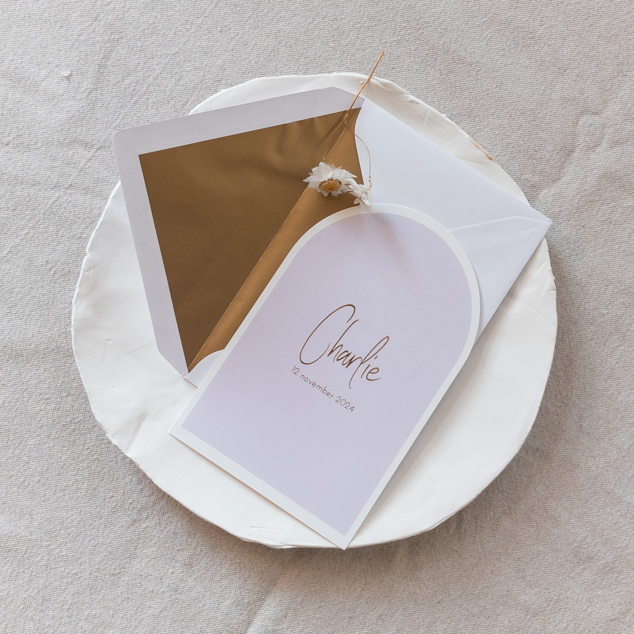 lila boog geboortekaartje met goudfolie