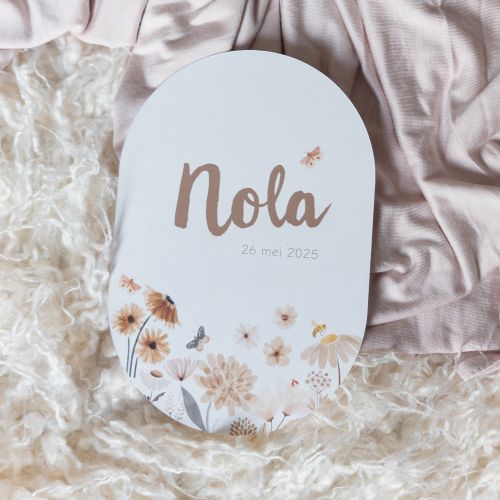 ovaal geboortekaartje met bloemenweide en vlinders