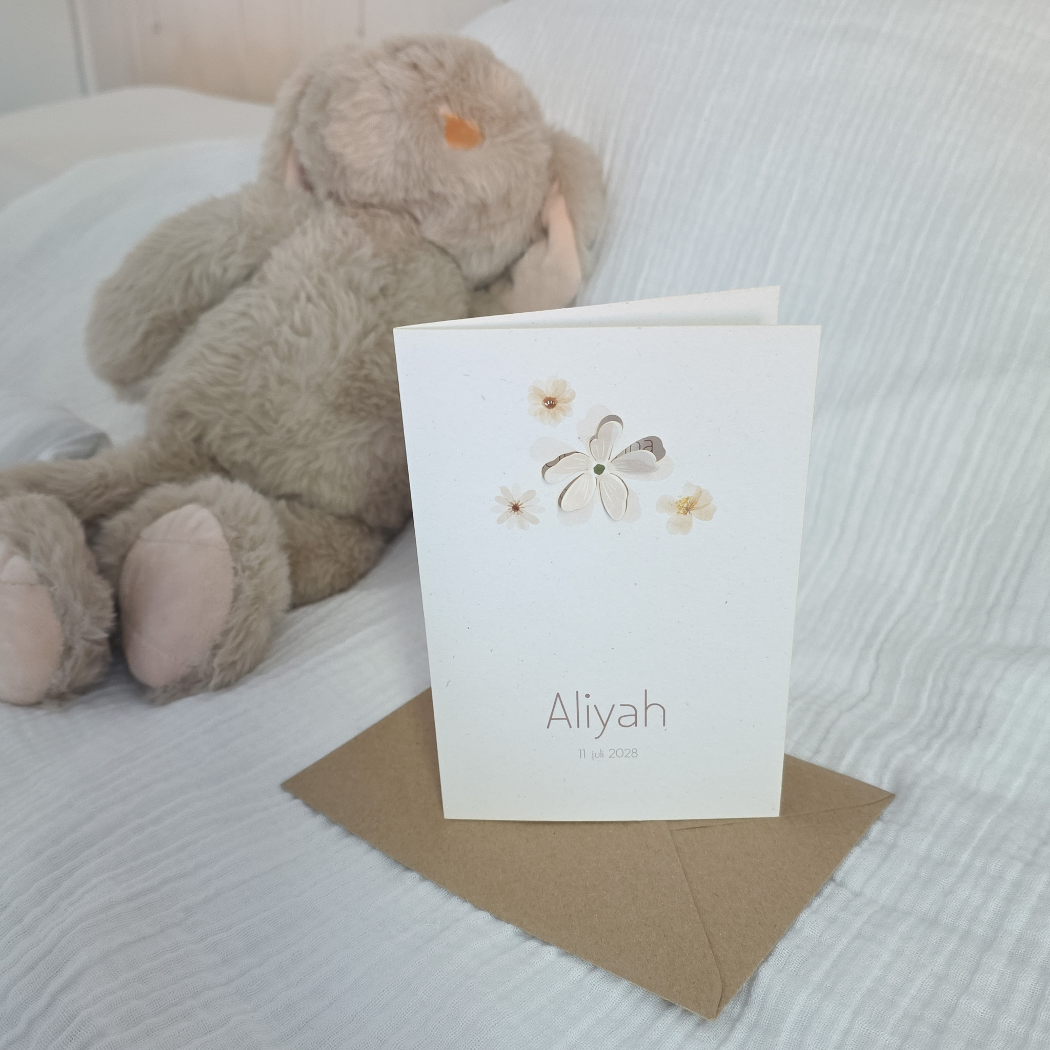 Trendy geboortekaartje met een kraftlook achtergrond, geprint op linnen papier.