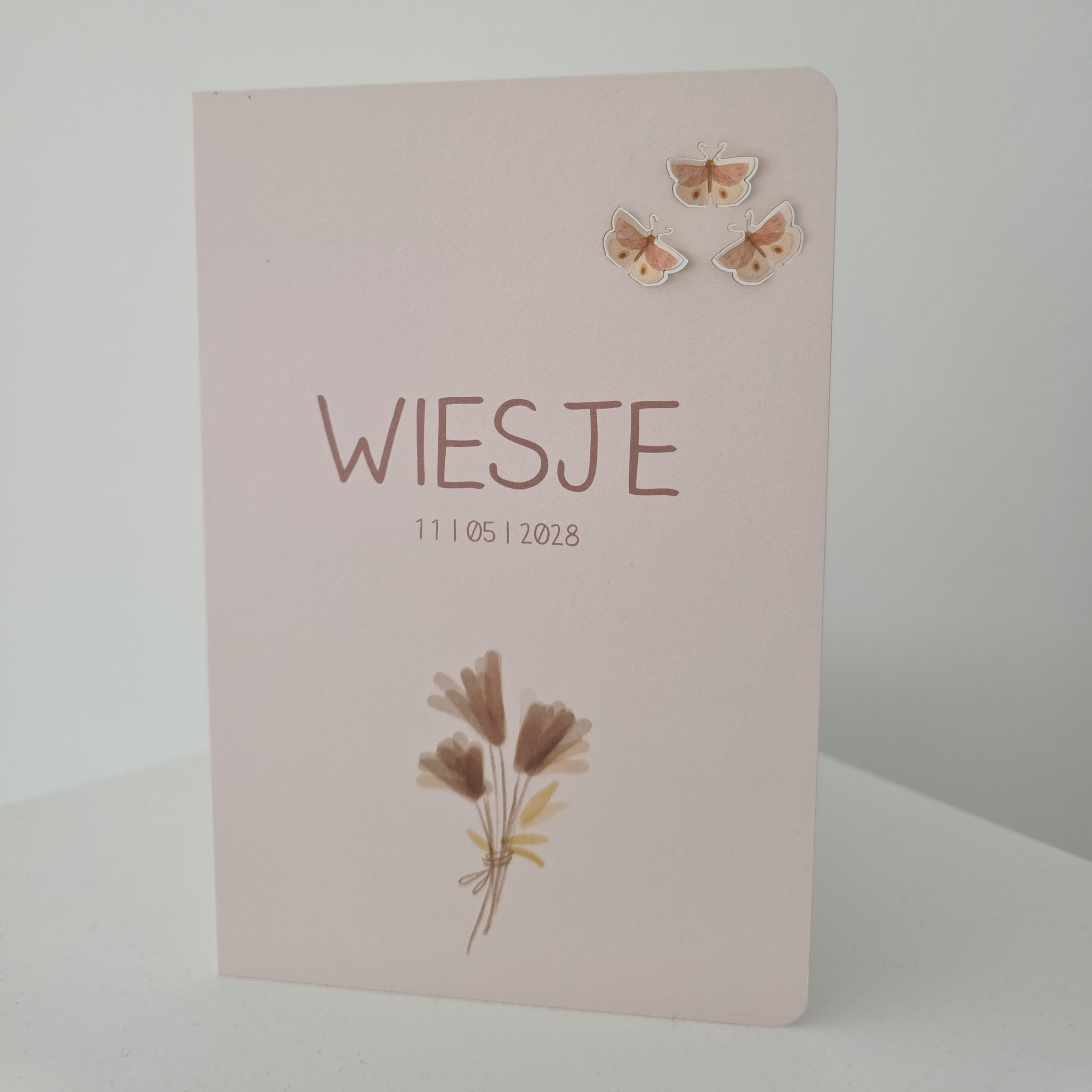 Naar wens kun je ook foliedruk toepassen en de kleuren aanpassen. De vlindertjes met hun stansvorm staan vast, deze kunnen niet gewijzigd worden.