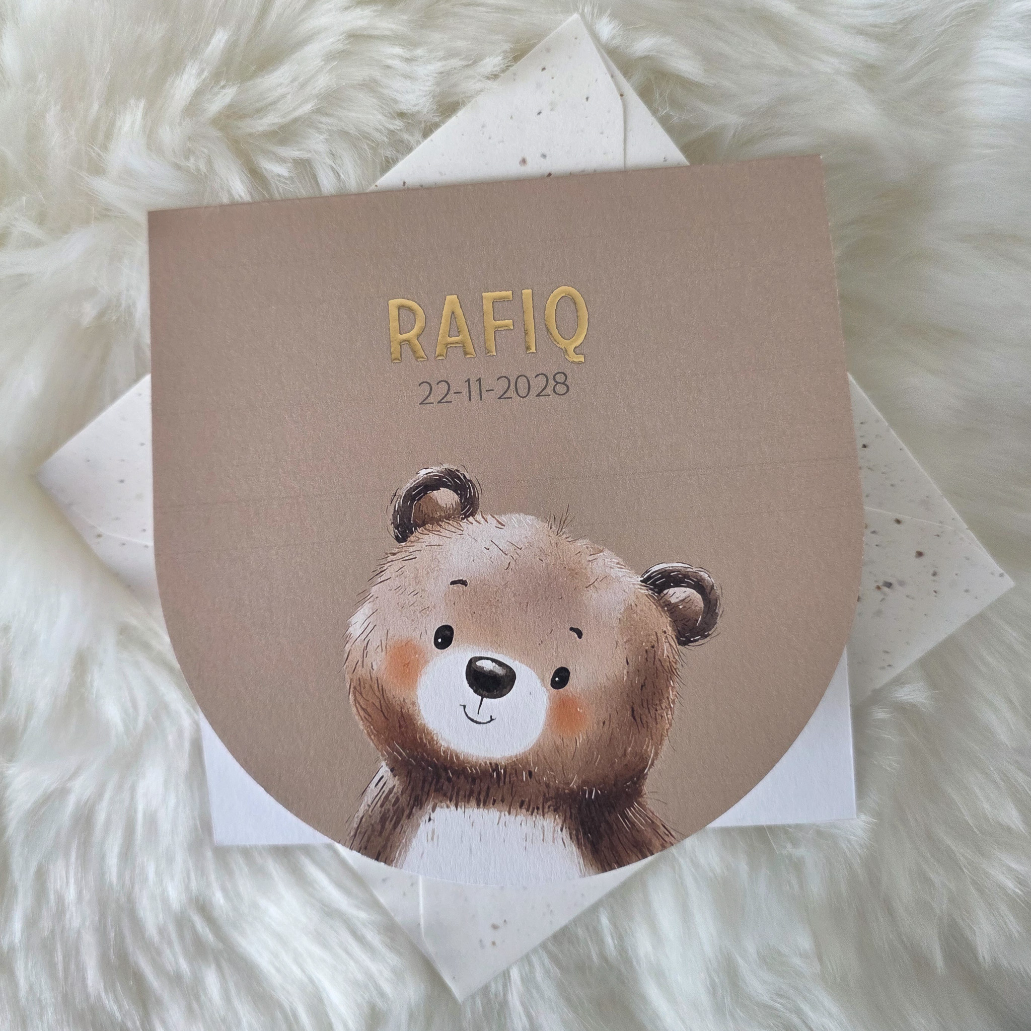 Geboortekaartje met boogvorm beer en goudfolie bruin