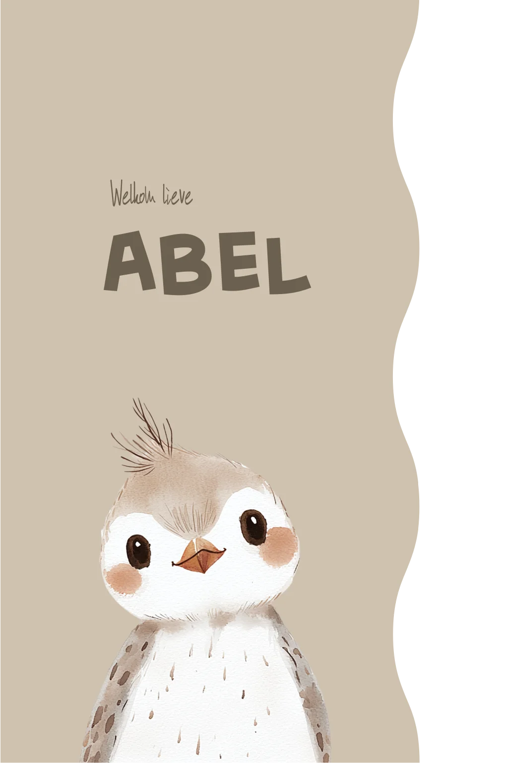 Geboortekaartje met een golfvorm op de voorkant. Het schattige vogeltje kun je ook vervangen voor een ander diertje uit onze beeldbank. Je vindt deze in de editor!