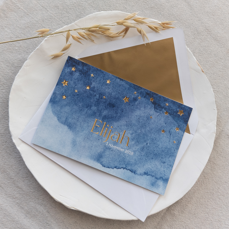 Origineel geboortekaartje voor jongens met op de voorkant uitgestanste sterren. Aan de binnenzijde zijn deze sterretjes in goudfolie afgedrukt, zodat je een uniek doorkijkje creeërt!