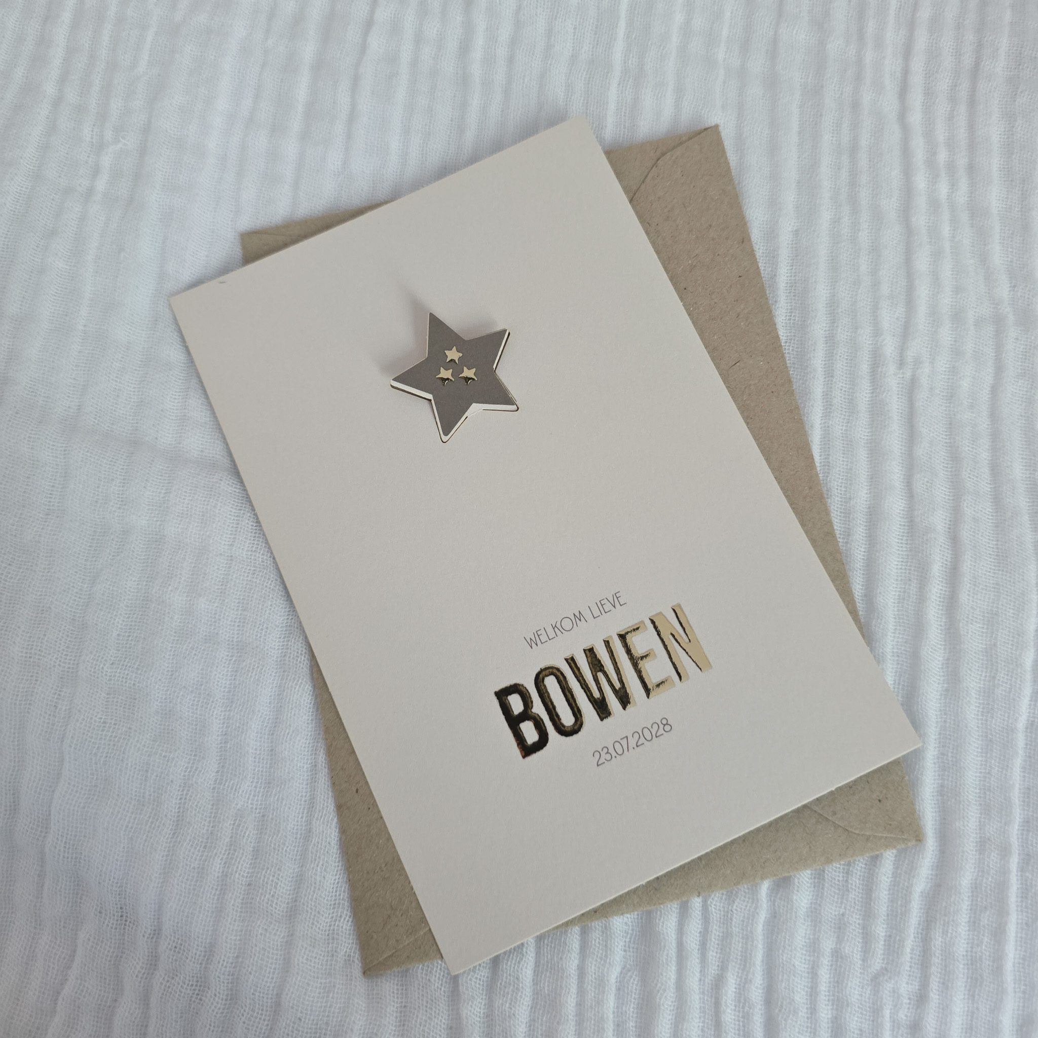 Ook de naam is gedrukt in goudfolie. Stoere bruine en beige kleuren waar het goudfolie prachtig op uit komt!