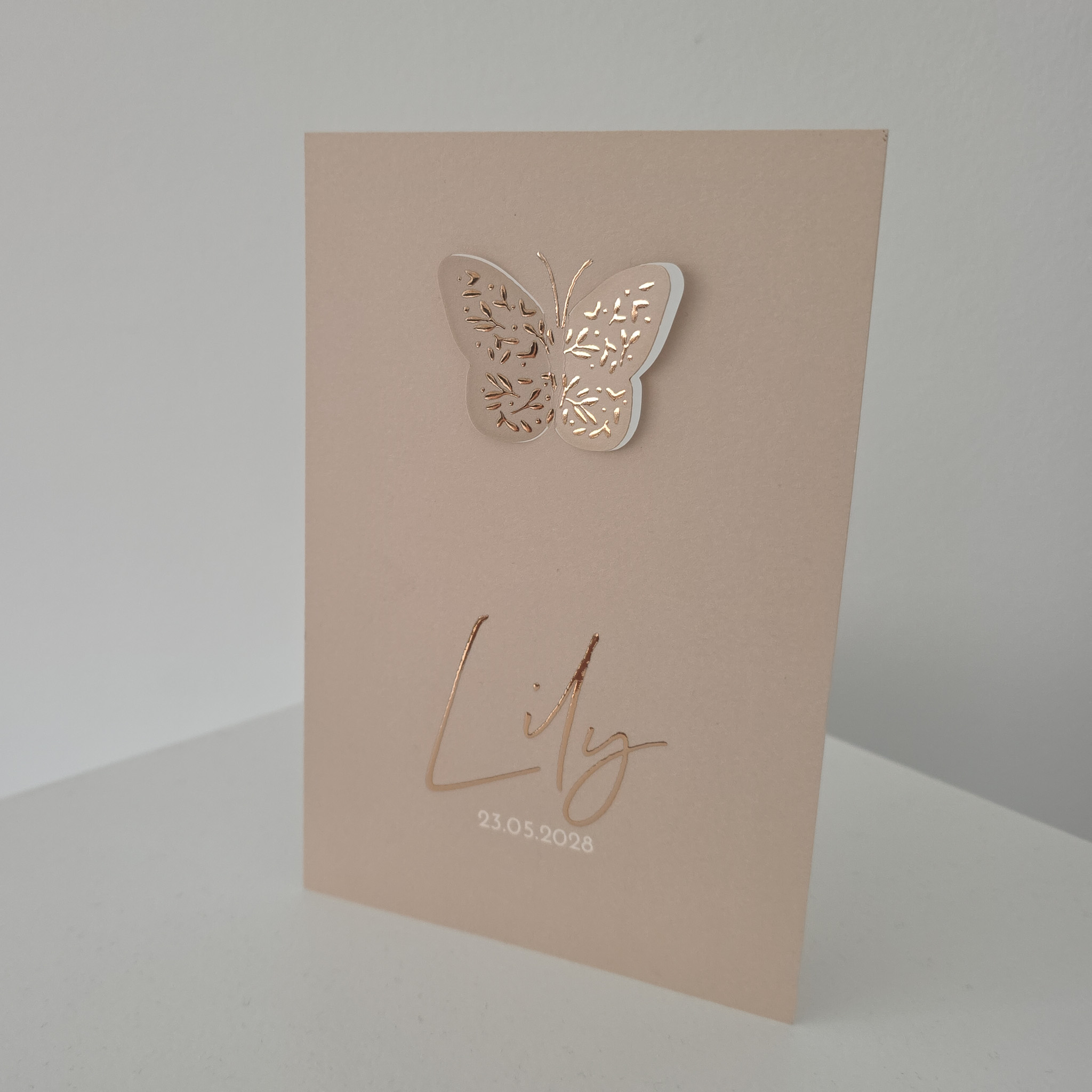 Geboortekaartjemeisje 3D vlinder rosefolie beige