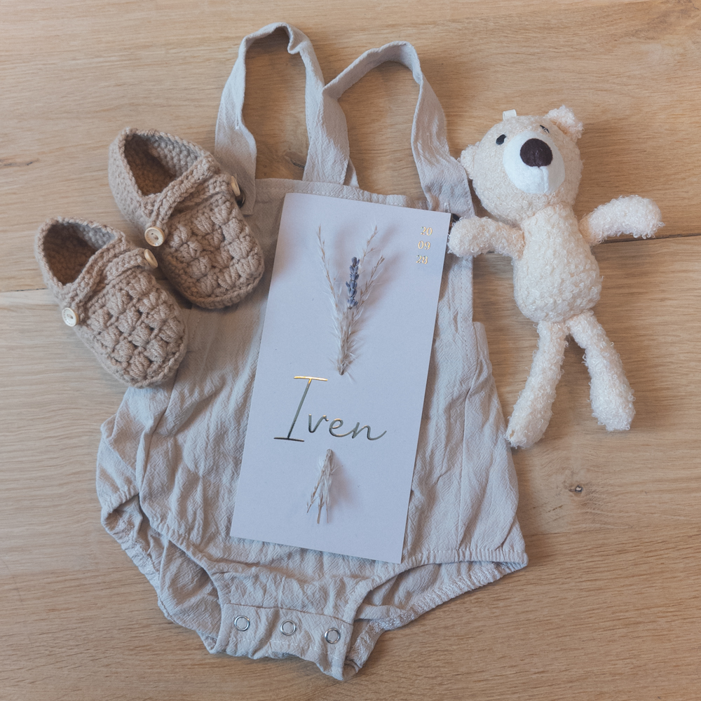 Gender neutraal geboortekaartje met gaatjes voor droogbloemen