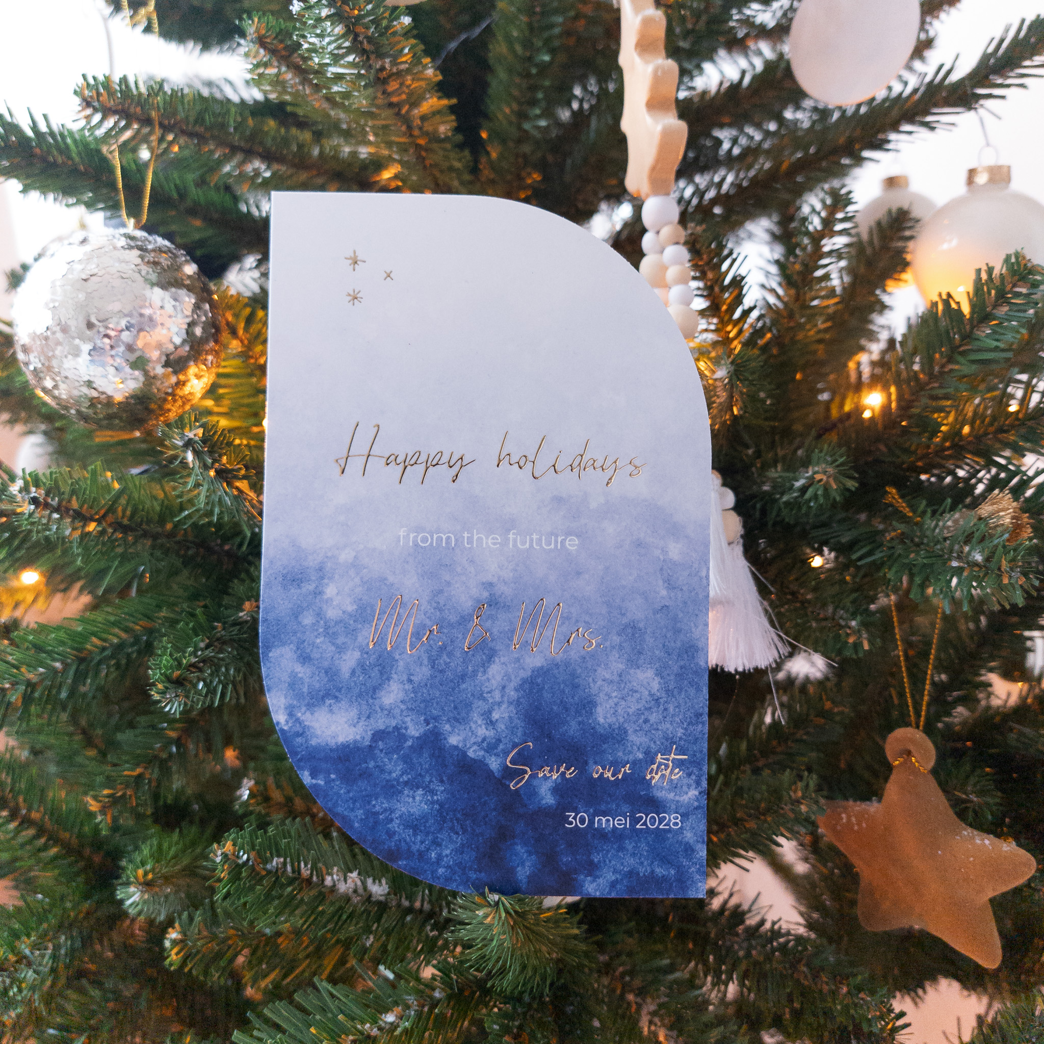 Kerst save the date donkerblauwe watercolor met goudfolie