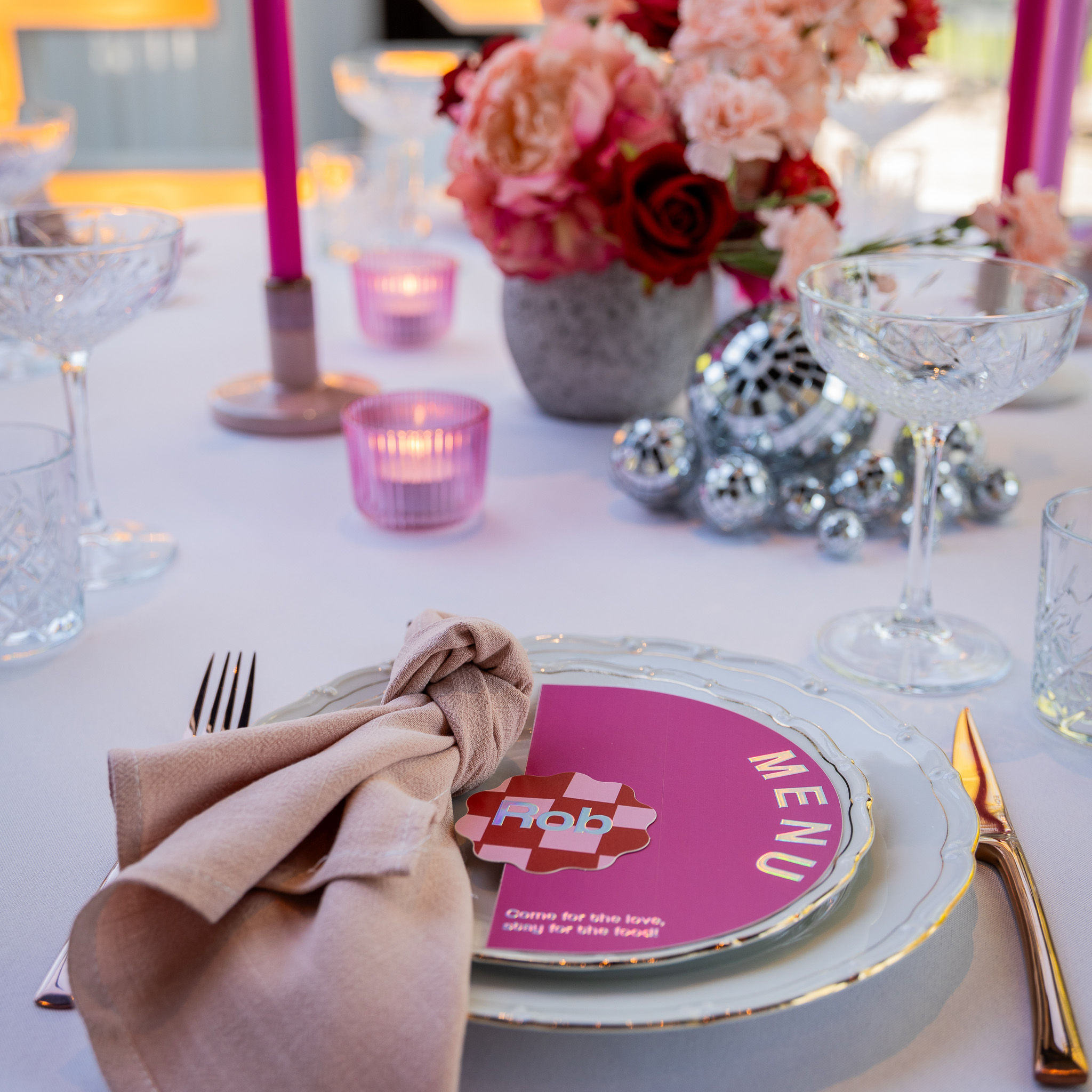 Knal kleur menukaart waar de bijpassende naamkaartjes perfect op uit komen! Het voorbeeld is in 10x15 cm geprint. Benadruk de kleur door voor coated karton te kiezen, zodat het mooi past bij de papiersoort van de hele trouw huisstijl Glamour pink.