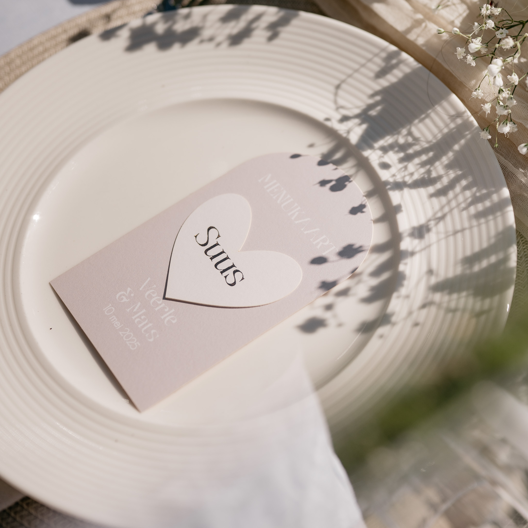 Menukaart in smalle boogvorm passend bij de trouw huisstijl Bridal blush van Veerle en Mats. De kaart is afgedrukt op linnen papier voor dit mooie kleurresultaat. De kaart heeft de afmetingen 8x15 cm. Het bijpassende naamkaartje in hartvorm leg je half op de menukaart, half op het bord, of helemaal op de menukaart!