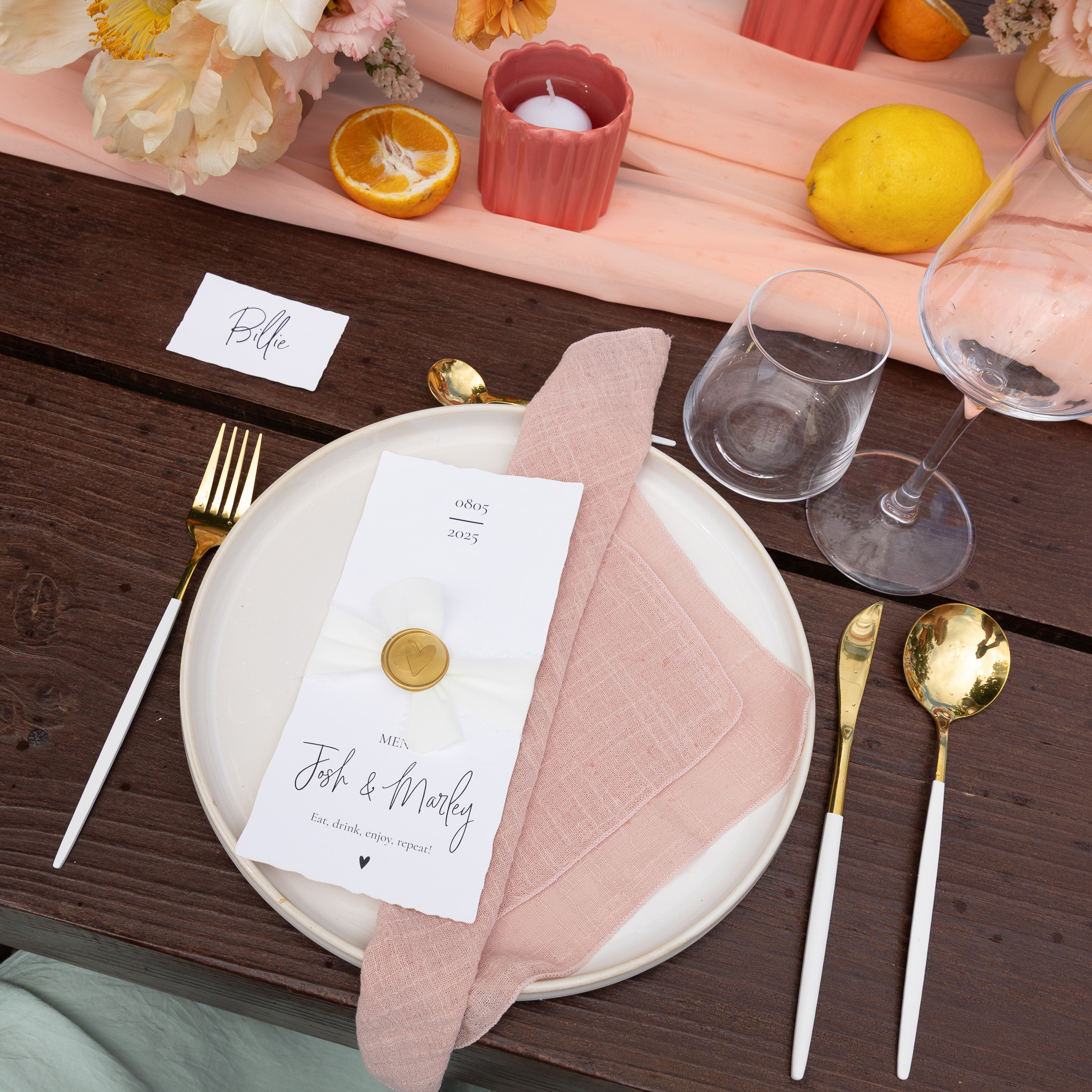 Helemaal passend in de trouw huisstijl Classy & stylish! Deze menukaart met handgeschept papier look wordt met een stansvorm gemaakt. Het lint is er in 4 verschillende kleuren, zodat je kunt kiezen wat er het best bij jullie grote dag past. Dit mooie lint bestel je er nog los bij. Voor dit voorbeeld gebruikte ik 45 cm lint.