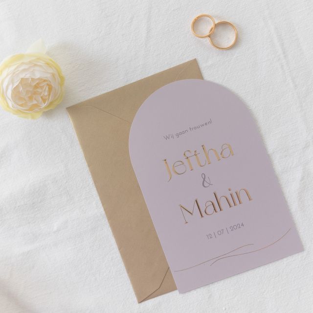 Stijlvolle trouwkaart in trendy lila kleuren, boogvorm en gecombineerd met goudfolie. Mooi in formaat 11x17 cm op de papiersoort linnen! Wil je de kleur benadrukken, kies dan voor MAT coated zoals op de voorbeeldfoto.