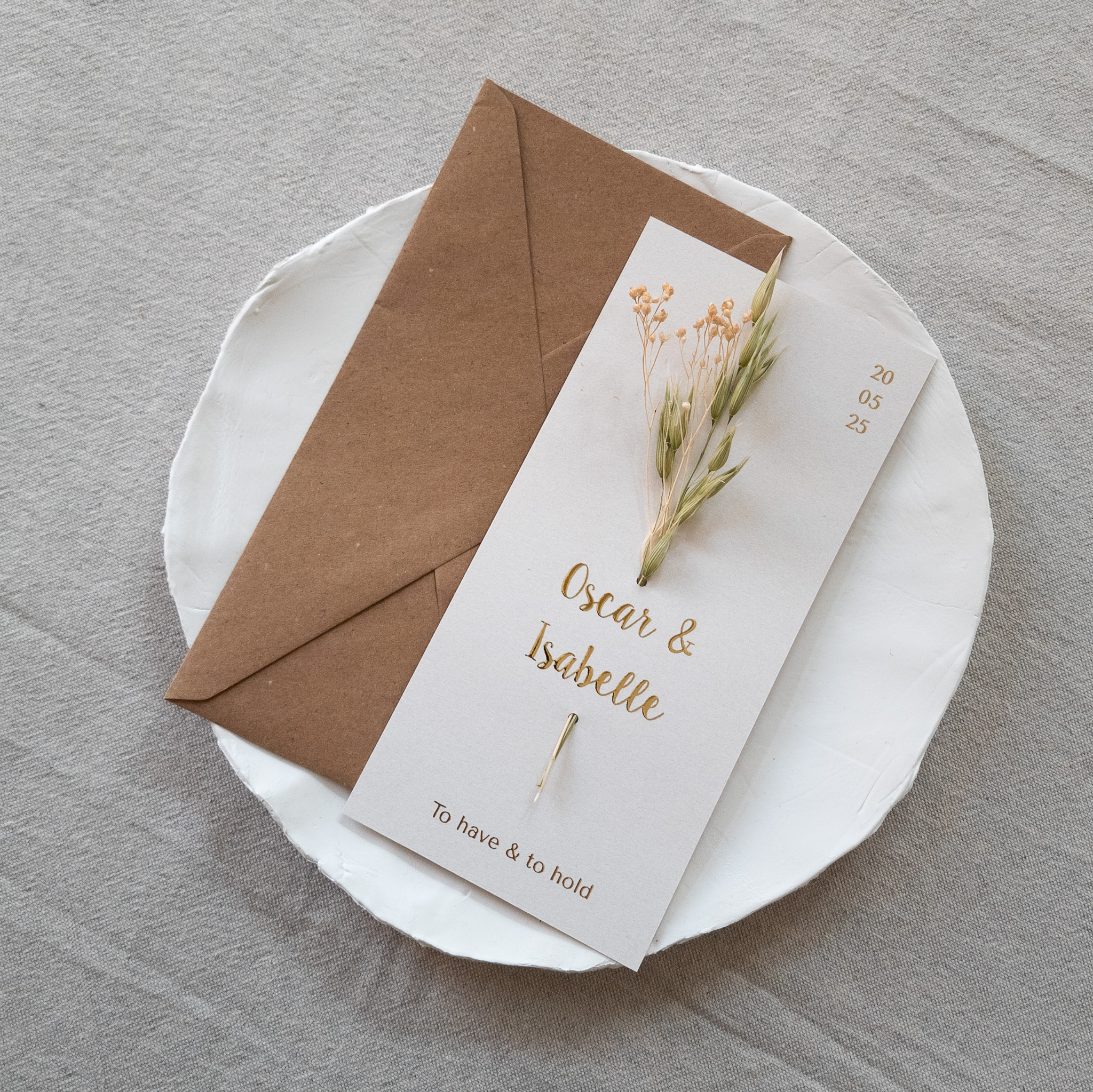 Trouwkaart met gaatjes voor droogbloemen langwerpig