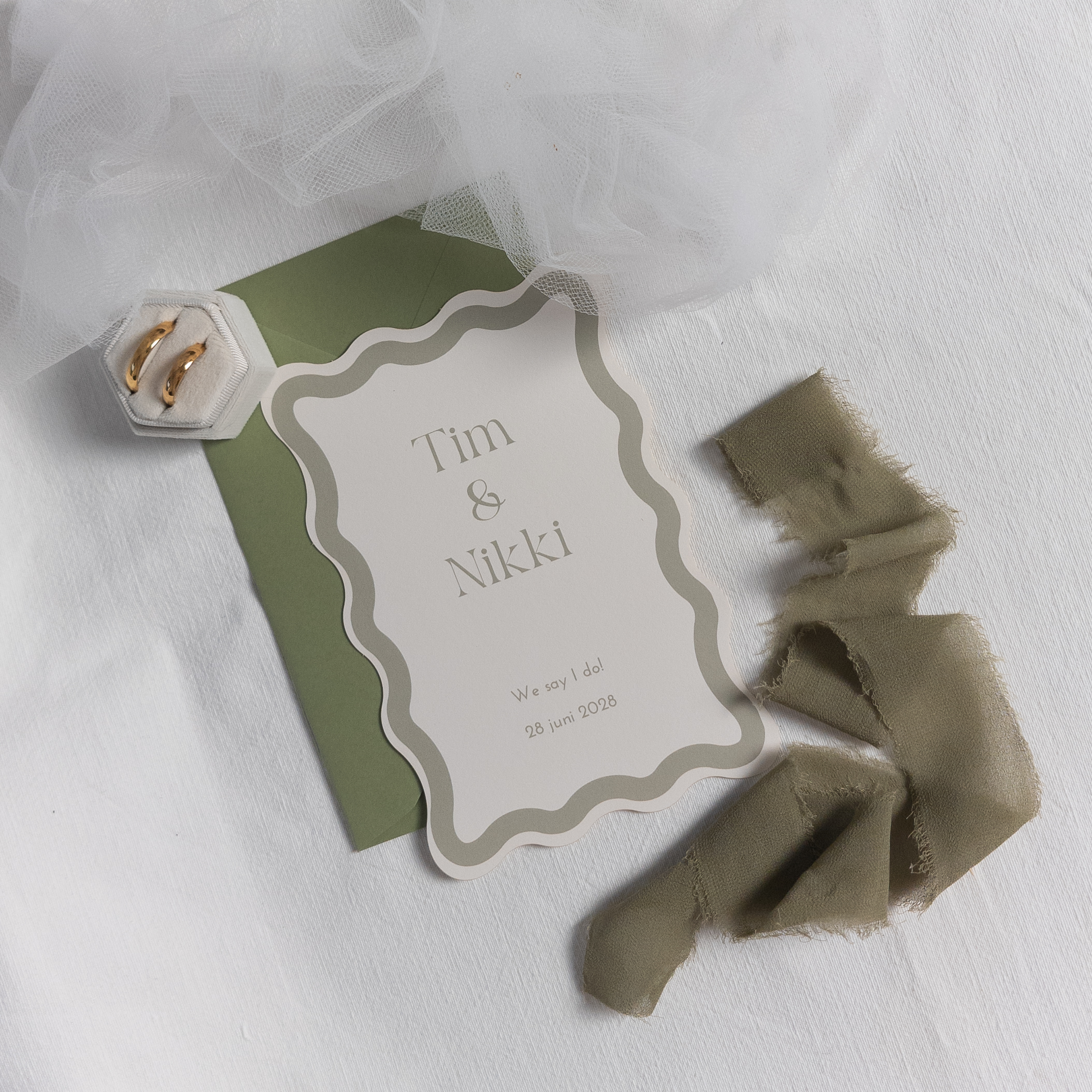 Trendy trouwkaart met golvende vorm in groen en gebroken wit. Make it you own trouwkaart door de kleuren naar jullie eigen kleuren palet aan te passen!