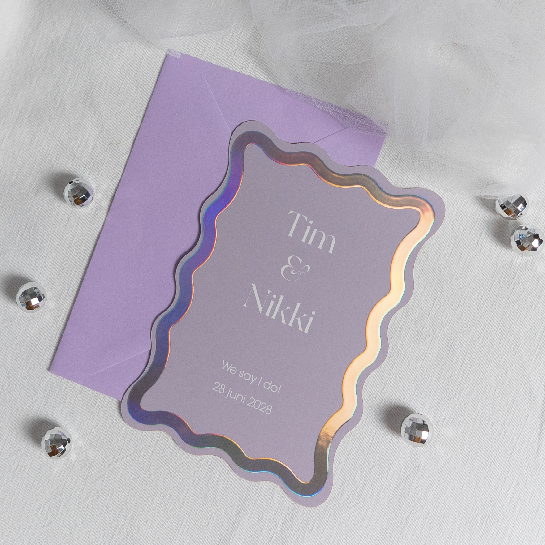 Trendy trouwkaart in lila wit en holografisch folie. Deze kaart spettert uit de envelop!