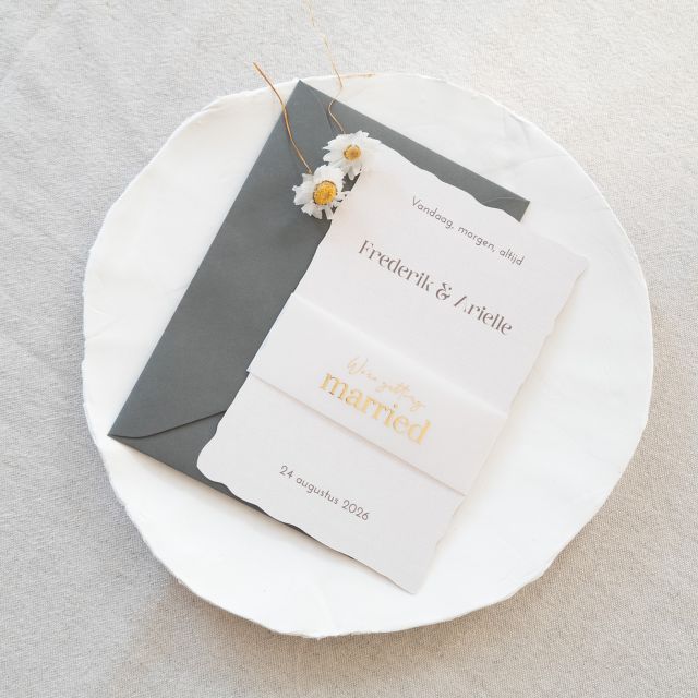 Deze chique trouwkaart zal je gasten omver blazen! De eenvoud laat deze kaart stralen en je kunt deze kaart nóg specialer maken met onze kalkpapier wikkels, zoals je op de voorbeeldfoto's kunt zien.