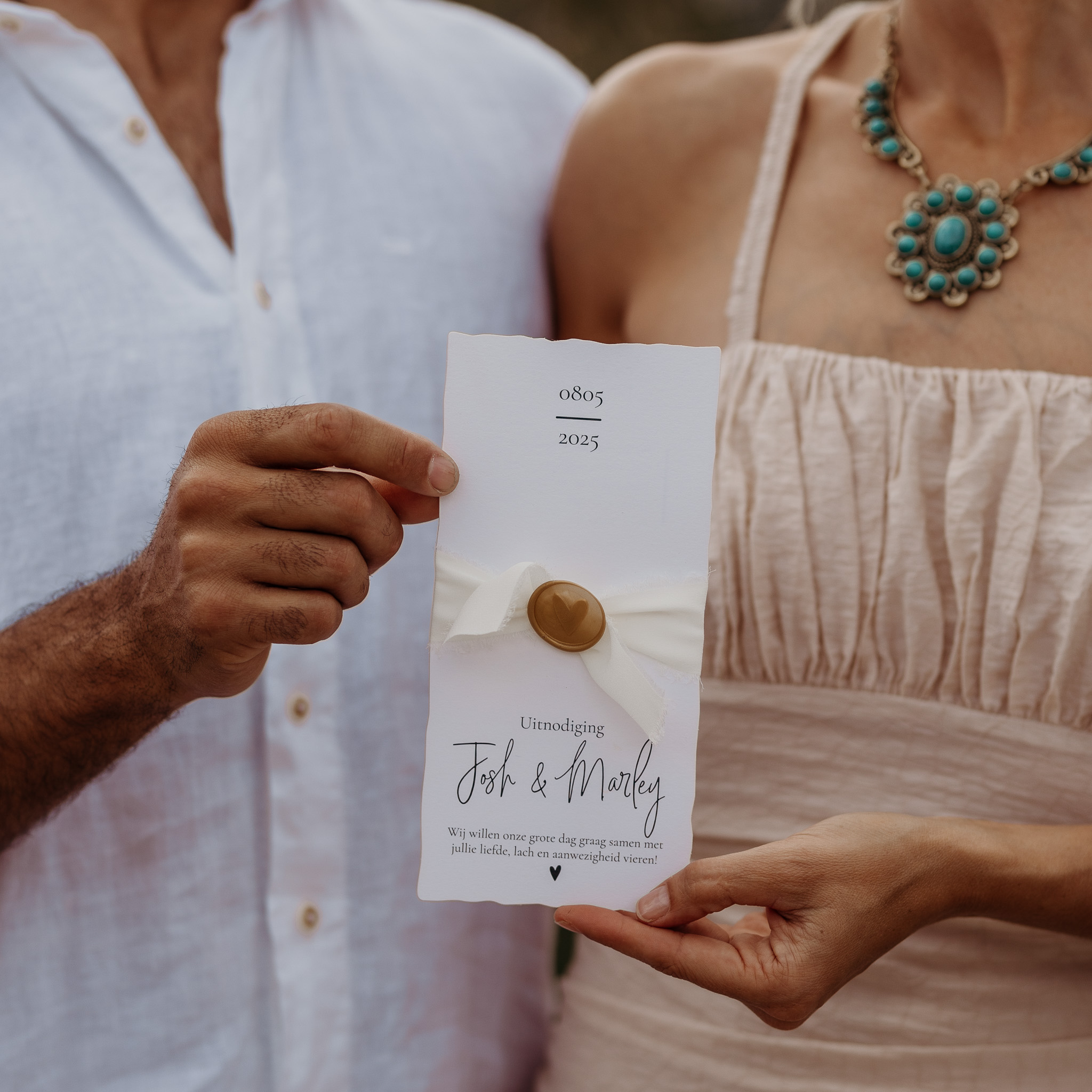 Stijlvolle en klassieke trouwkaart met een handgeschept look rand die door middel van een stansvorm door de drukker voor jou wordt gemaakt!