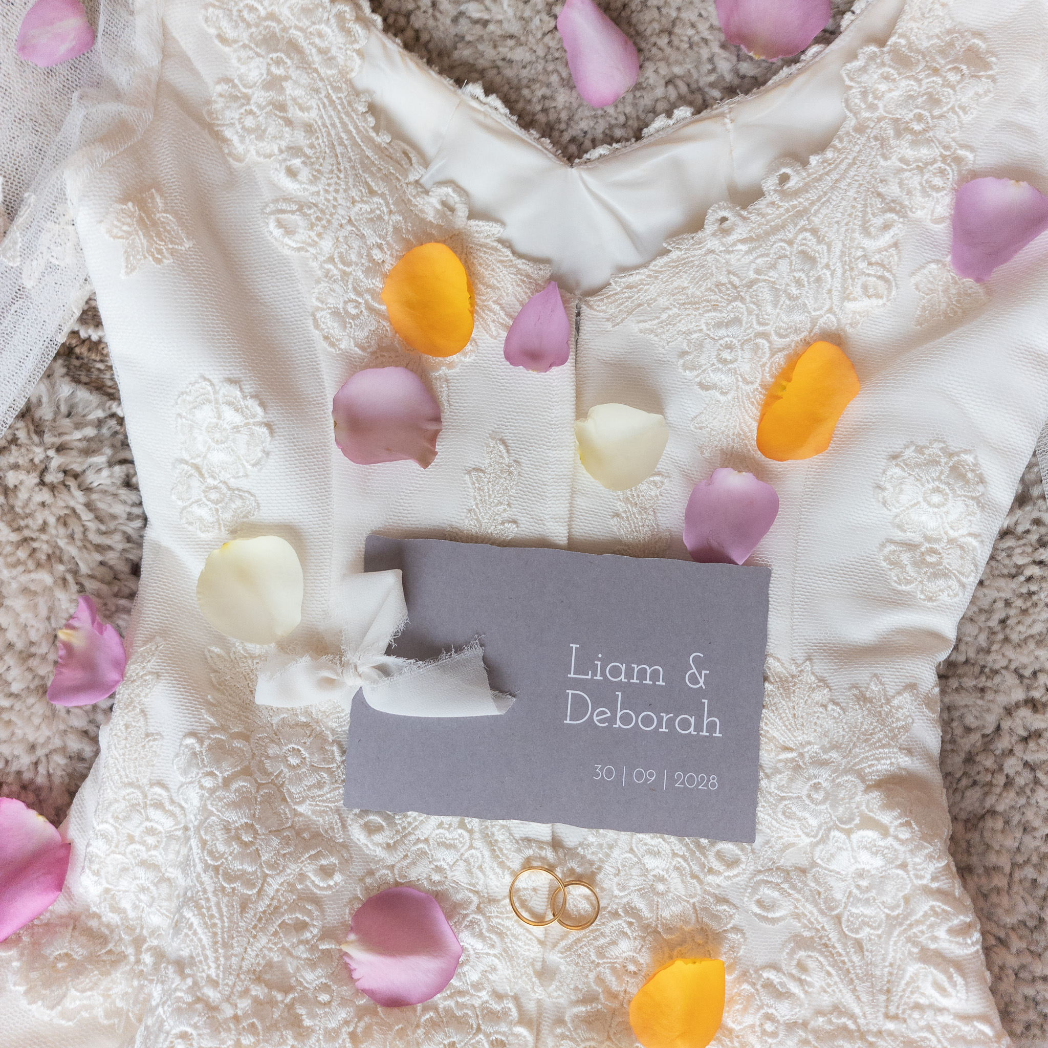 Deze eenvoudige en strakke trouwkaart kun je als save the date en als trouwkaart gebruiken. Het gaatje is voorgestanst, evenals de handgeschept look rand. Door het gaatje haal je 28 cm ecru zijden lint om dit mooi te kunnen strikken. Dit bestel je er zelf nog los bij via menu extra's. De afmeting van de kaart is 11x 17 cm en daar heb je enveloppen 12x 18 cm bij nodig.