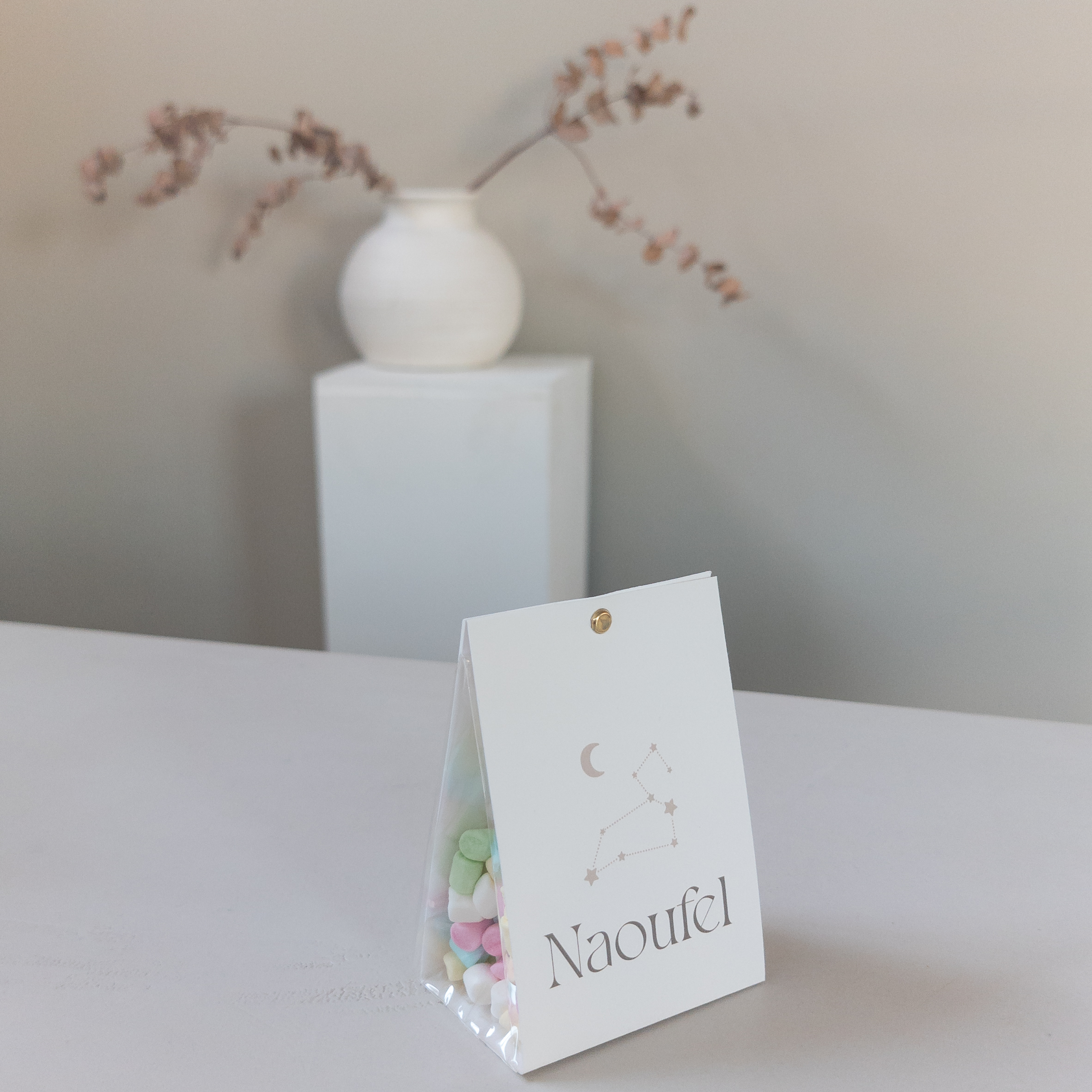 Passend bij geboortekaartje Naoufel, kun je dit mini tentkaartje gebruiken als doopsuiker of geboortebedankje.