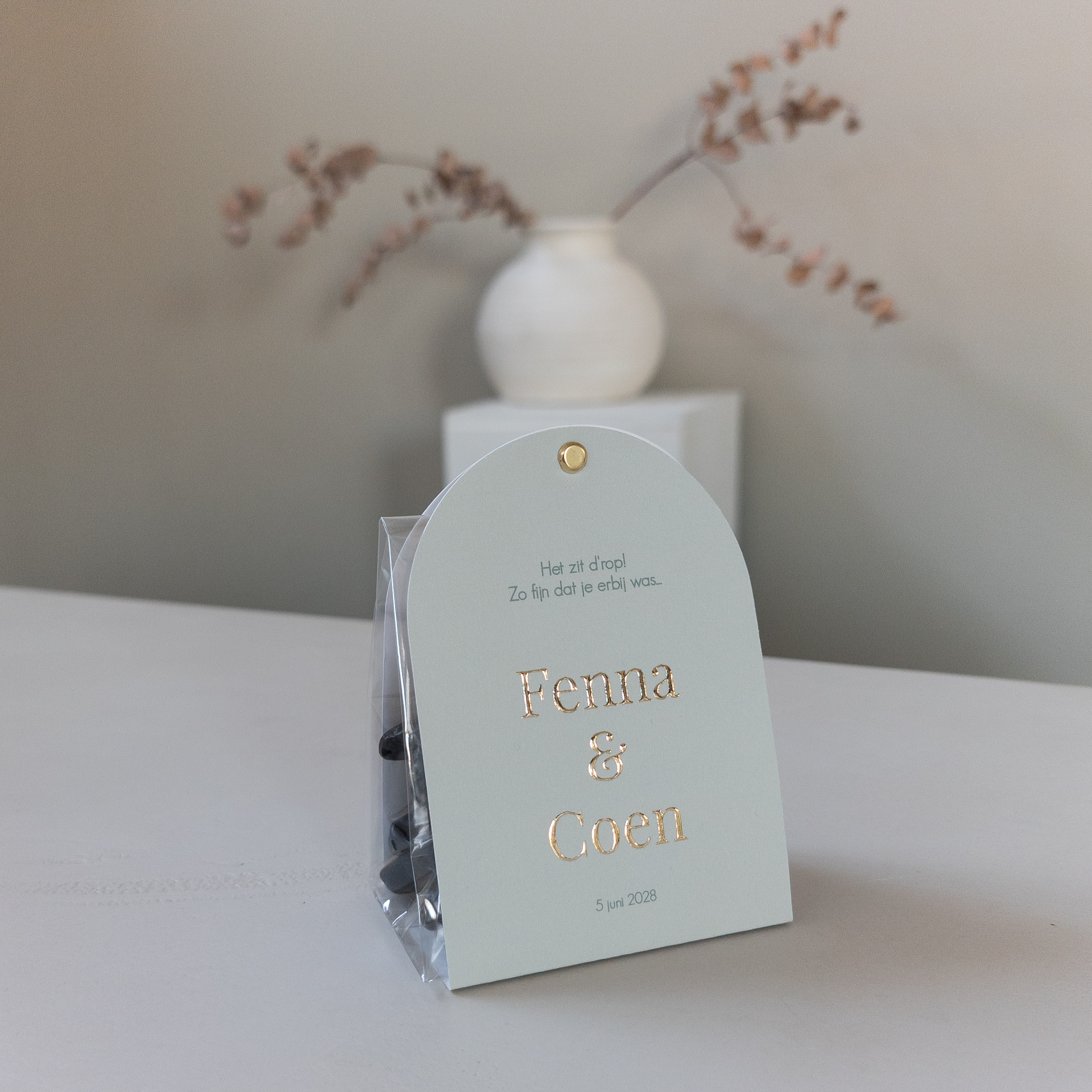 Dit kleine tentkaartje komt ongevouwen bij je aan. Voeg zelf je favoriete dropjes toe en bestel de transparante zakjes er los bij.