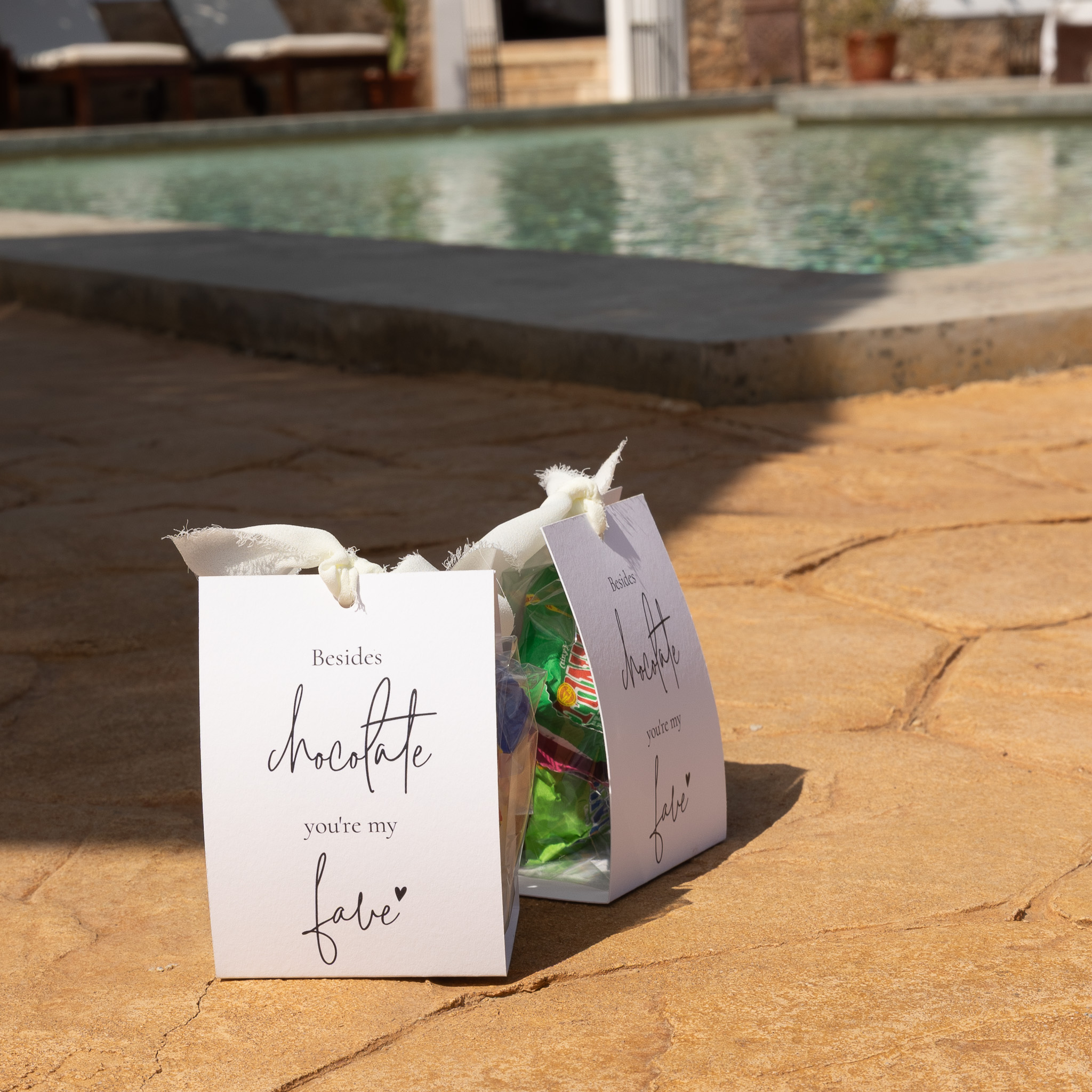Deze chocolade verpakking voor je bruiloft past in de trouw huisstijl Classy & stylish. Het mini tentkaartje komt ongevouwen bij je aan. De gaatjes zitten er al in, vergeet niet splitpennen en zakjes mee te bestellen!
