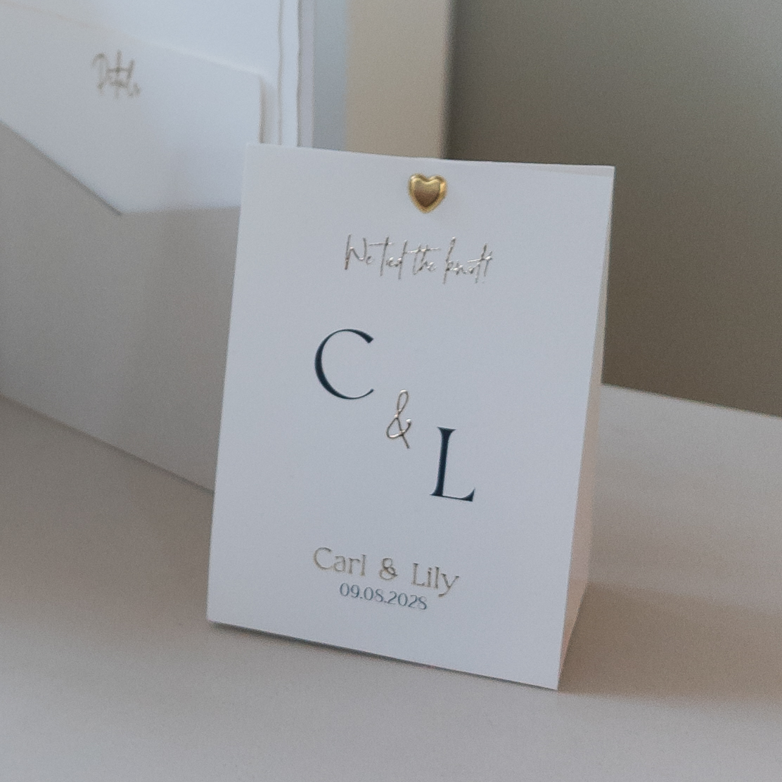 Passend bij de trouwkaarten van Carl en Lily, kun je dit mini tentkaartje gebruiken als trouwbedankje. De transparante zakjes bestel je er nog los bij.