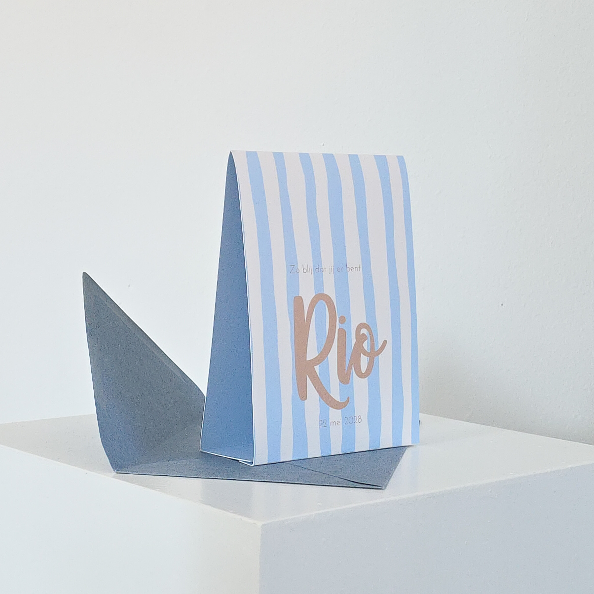 Origineel geboortekaartje in tentvorm met streepjespatroon in poeder blauwe strepen en beige bruine accenten.