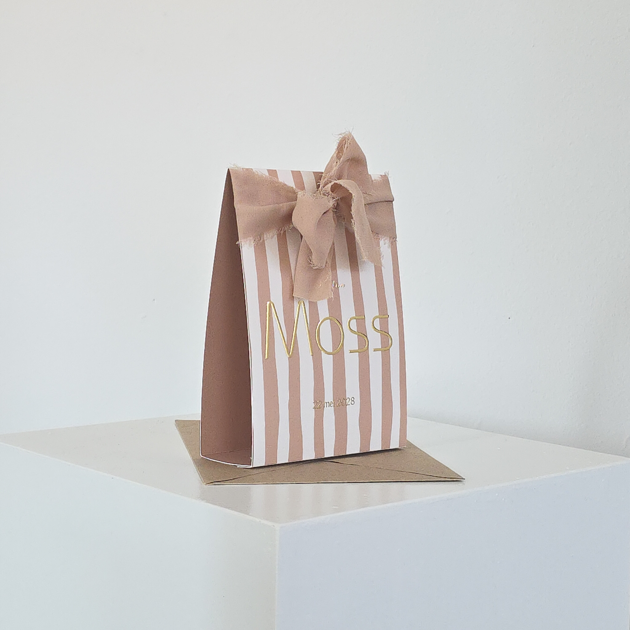 Zo'n gaaf geboortekaartje in tentvorm. Op de voorzijde een gestreept patroon in een mooie warm beige tint. De naam en geboortedatum zijn in goudfolie gedrukt, net als de accenten op de achterkant van het geboortekaartje. Omdat de print op de voorzijde best aanwezig is, hield ik de binnenkant en achterkant van het geboortekaartje rustig.
