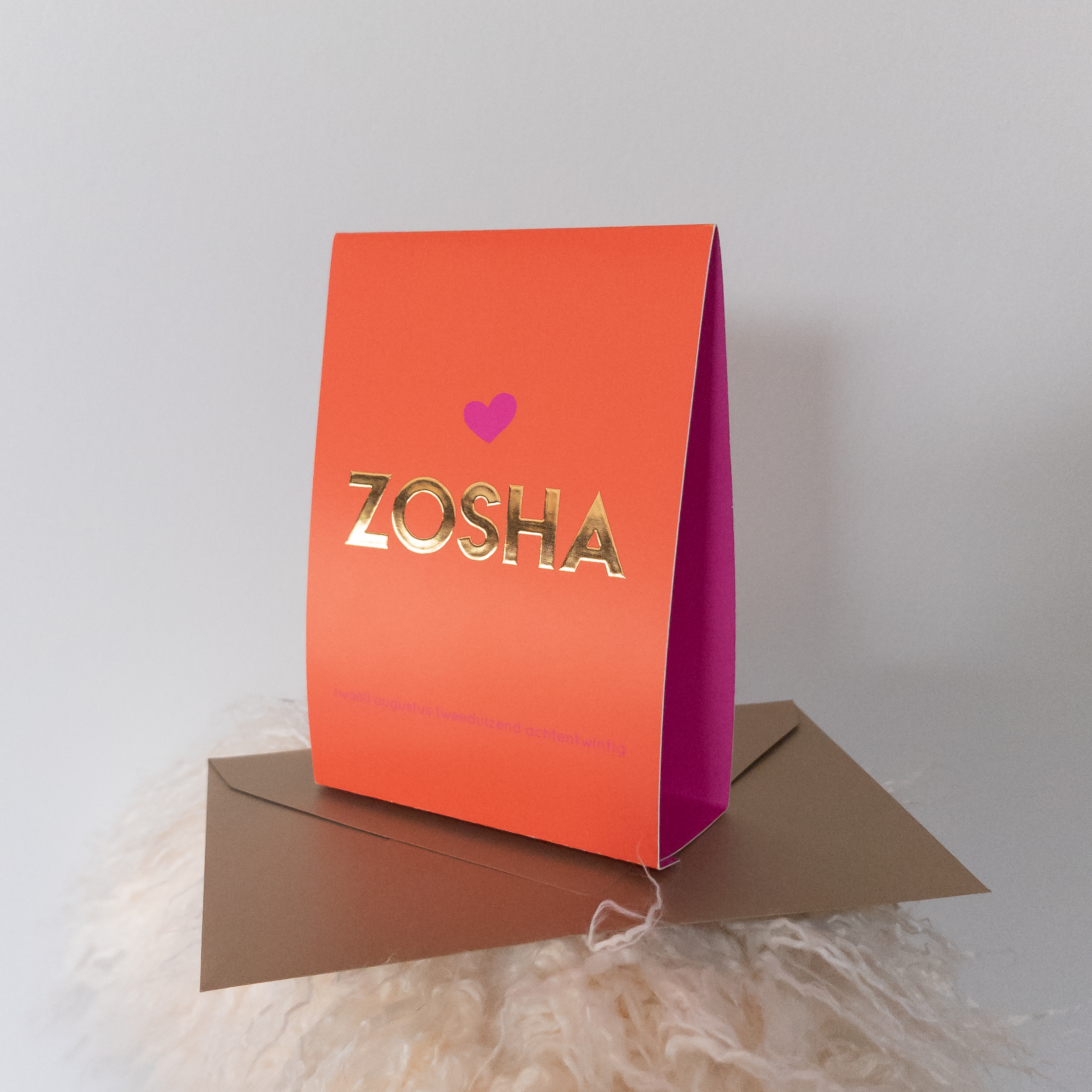 Tent geboortekaartje met een oranje buitenkant en een fuchsia binnenkant.