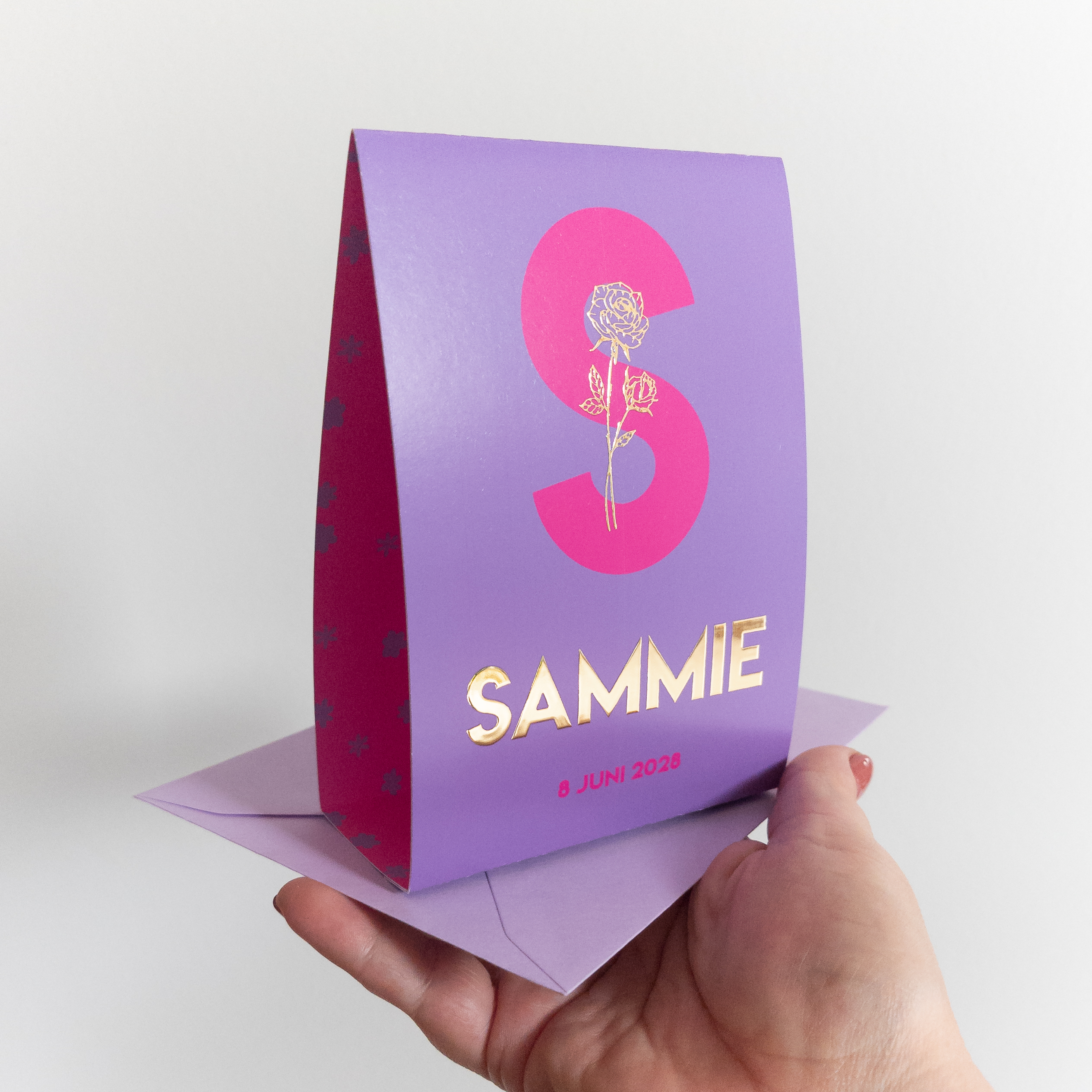 Tent geboortekaartje met een lilapaarse buitenkant en een fuchsia roze binnenkant.