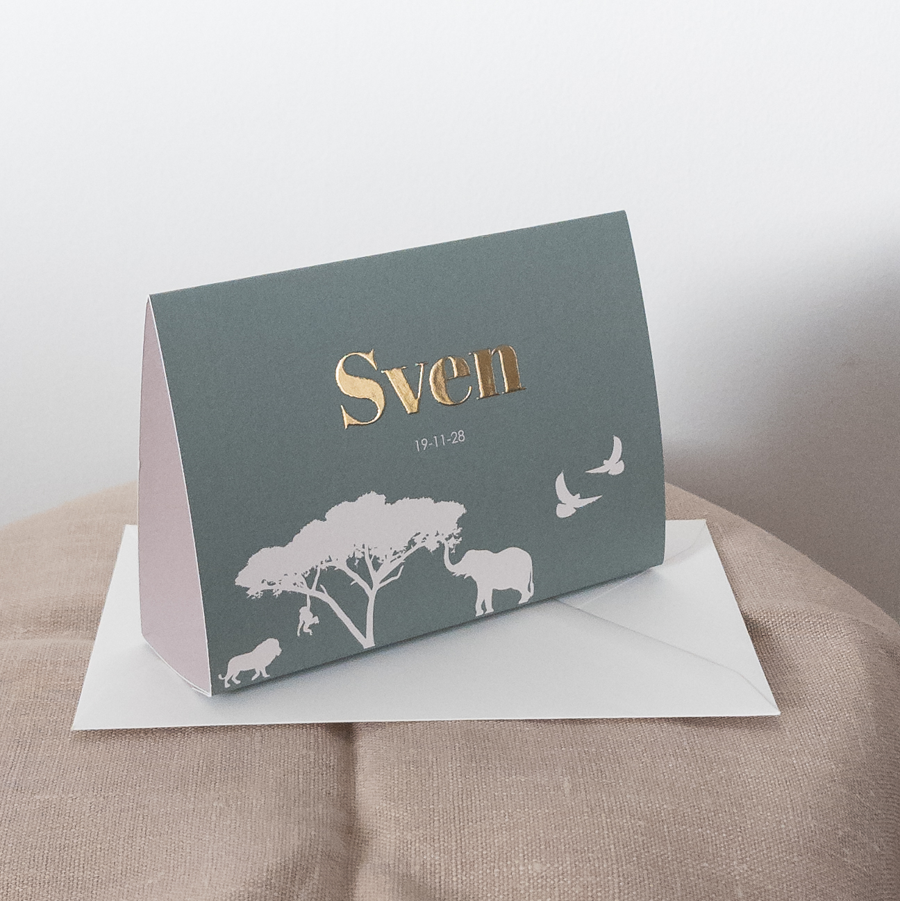 Liggend tent geboortekaartje met silhouetten van jungle dieren. De kleuren kun je aanpassen en als je wilt, kun je ook de foliekleur aanpassen.