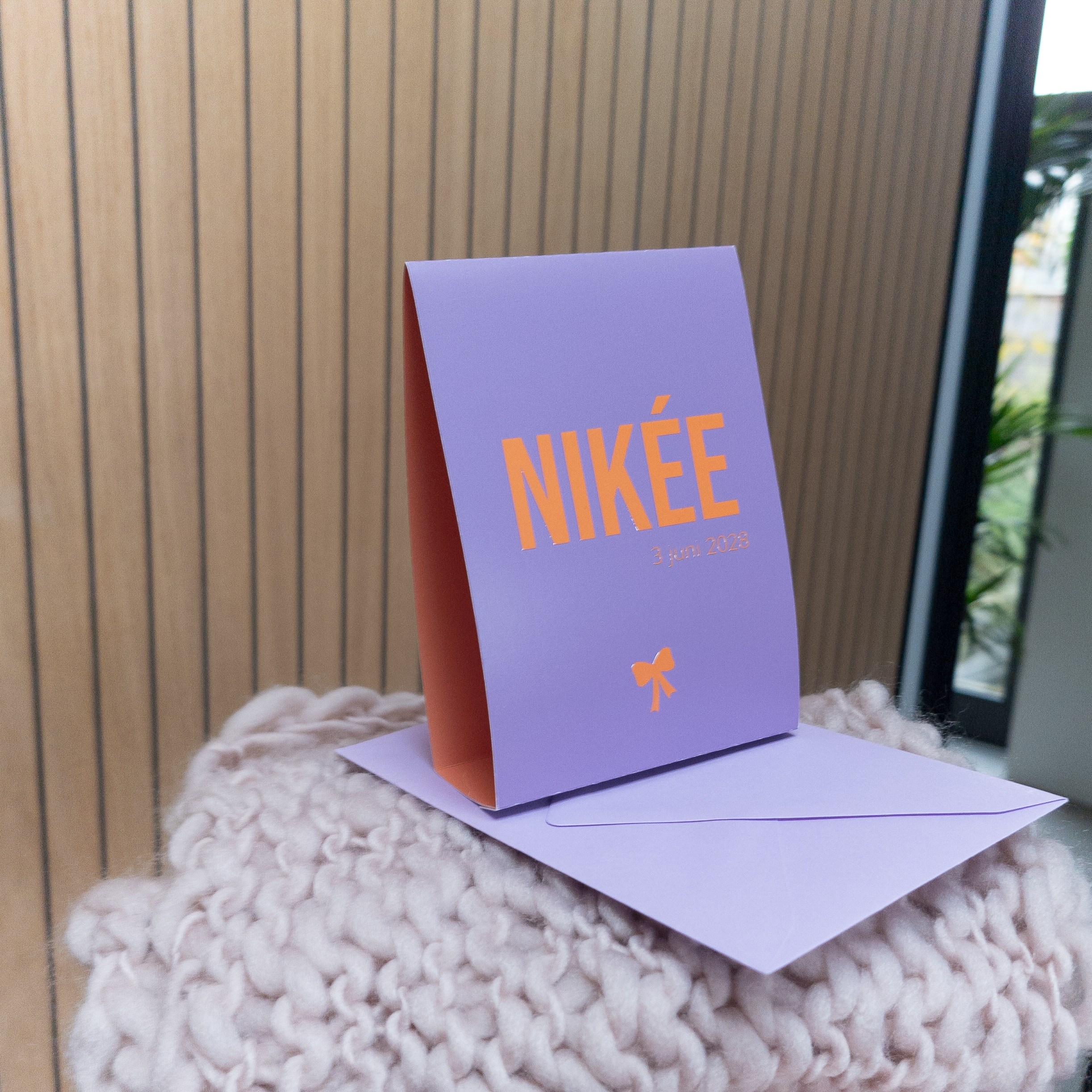 Tent geboortekaartje in knalkleuren lilapaars en oranje met UV spotlak aan de voorzijde op de naam, datum en het strikje. Uv spotlak is een hoogglans blanke lak die eroverheen wordt aangebracht. LET OP: Om de kleuren het best tot zijn recht te laten komen, bestel je deze kaart op coated karton, zoals op het voorbeeld. Op linnen papier zullen de kleuren wat lichter/fletser zijn.