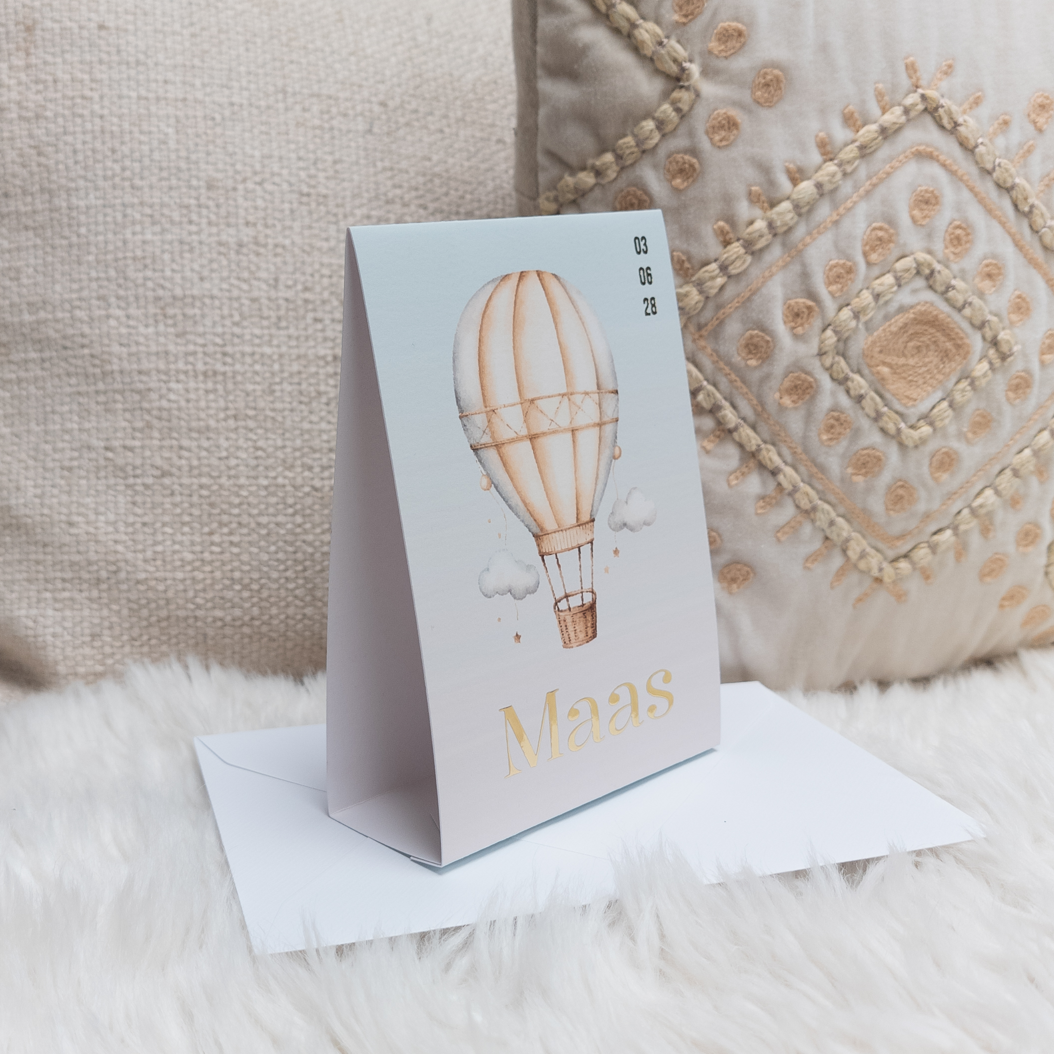Tent geboortekaartje in zand en zachtblauw met luchtballon en goudfolie.