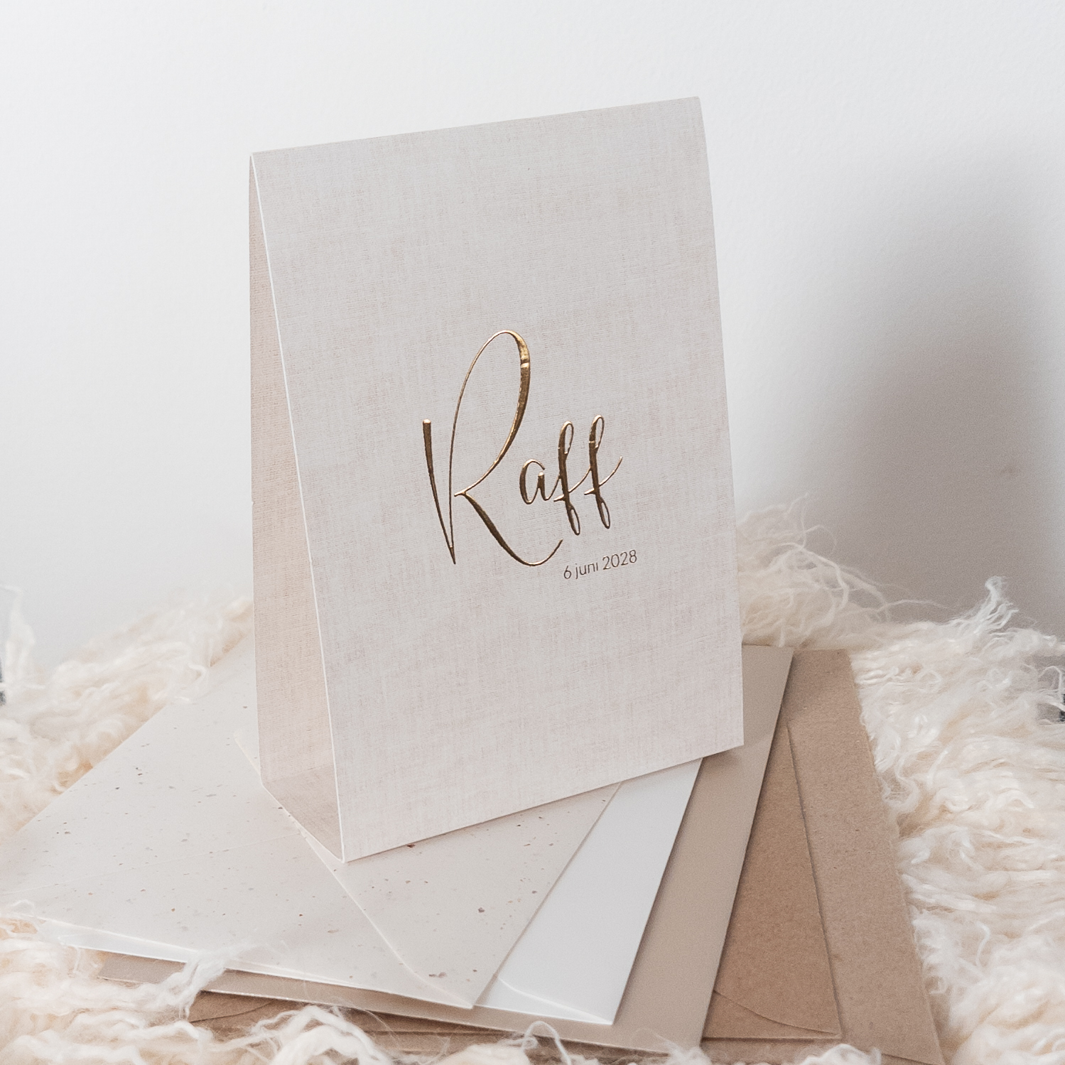 Tent geboortekaartje in naturel linnen look met goudfolie op de voorkant. De binnenkant heeft dezelfde linnenlook print. Natuurlijk kun je elk kaartje naar wens vormgeven en aanpassen. Het voorbeeld is op coated karton gedrukt, maar de print komt ook erg mooi tot zijn recht op linnen papier.