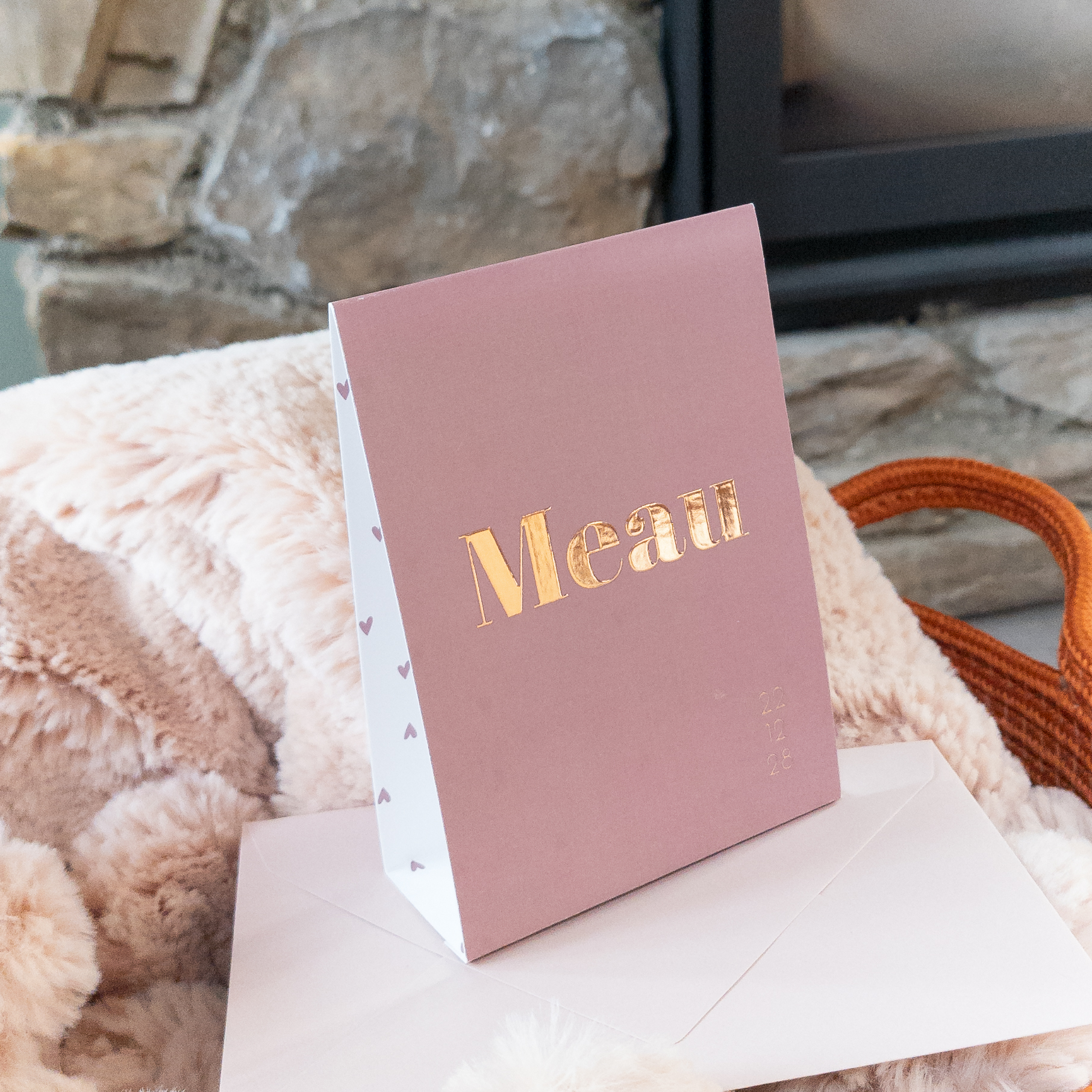 Een geboortekaartje in de vorm van een tent! Het meest originele geboortekaartje wat er is. Hier vormgegeven met een warme kleur en gecombineerd met roséfolie. De binnenkant is voorzien van een schattige hartjes print. Het voorbeeld is gedrukt op coated karton. Wil je hem wat zachter van kleur, dan kun je op linnen papier bestellen!