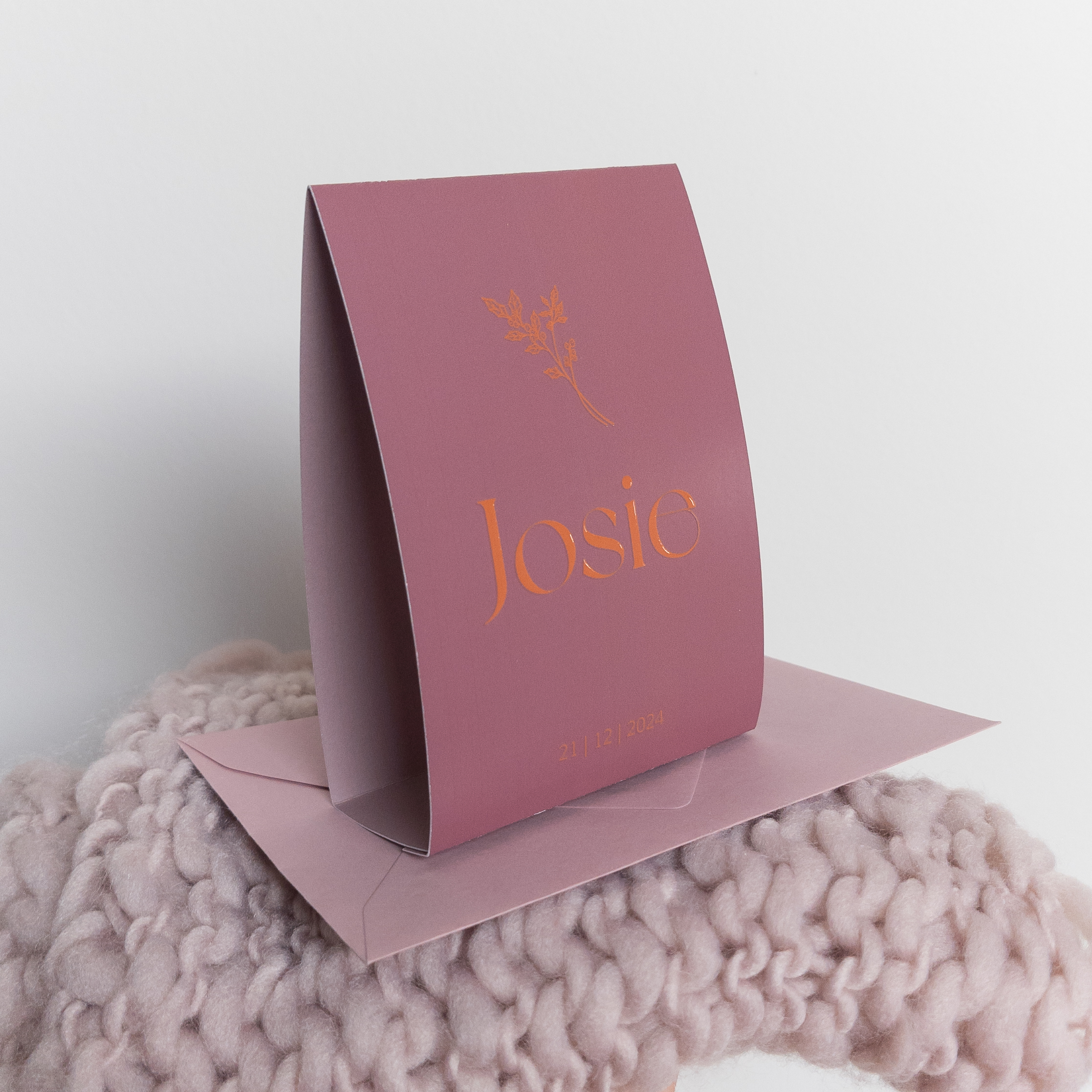 Tentkaartjes zie je niet vaak en daardoor zijn ze super origineel als geboortekaartje. Dit tent geboortekaartje heeft een sprekende, diepe achtergrond kleur, waarbij de binnenkant in een complementaire kleur werd afgedrukt. De geboortebloem past bij de maand december: hulst. De kaart op de foto werd op coated karton gedrukt, voor het mooiste kleur resultaat. Wil je een wat zachter, pastel effect, dan kun je deze kaart ook heel mooi op linnen papier bestellen.