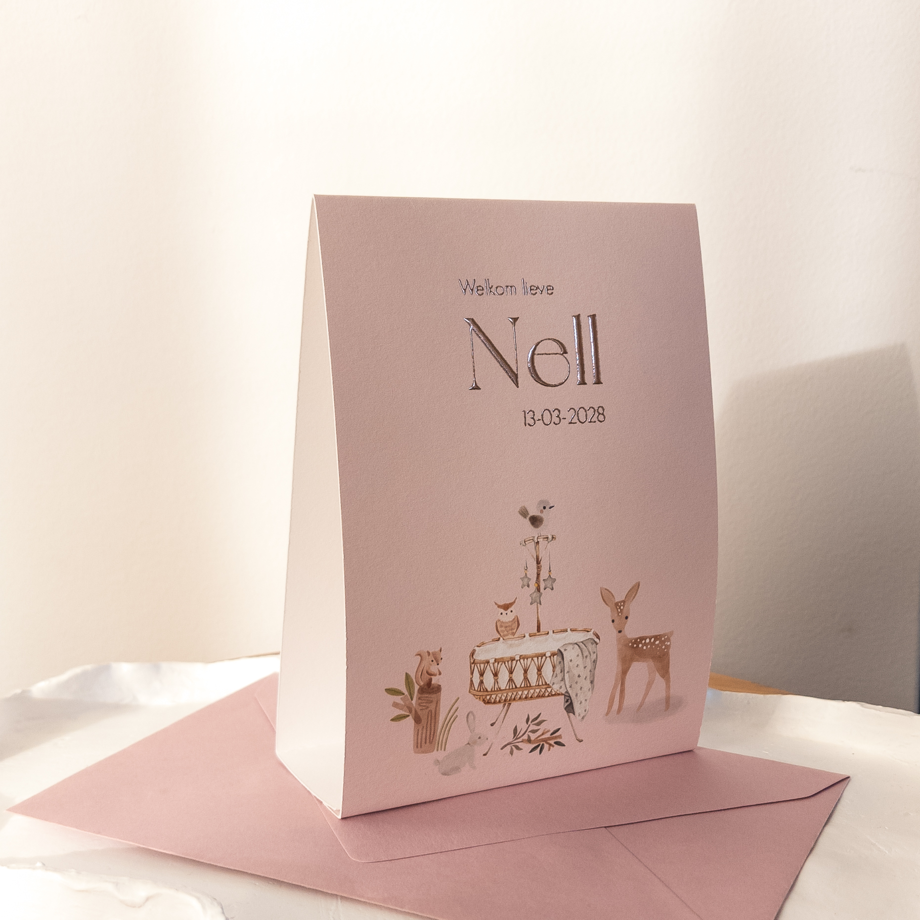 Voorbeeld is gedrukt op linnen papier waar de watercolor tekening prachtig op uit komt! De binnenkant is wit gelaten voor een zacht en lief effect.