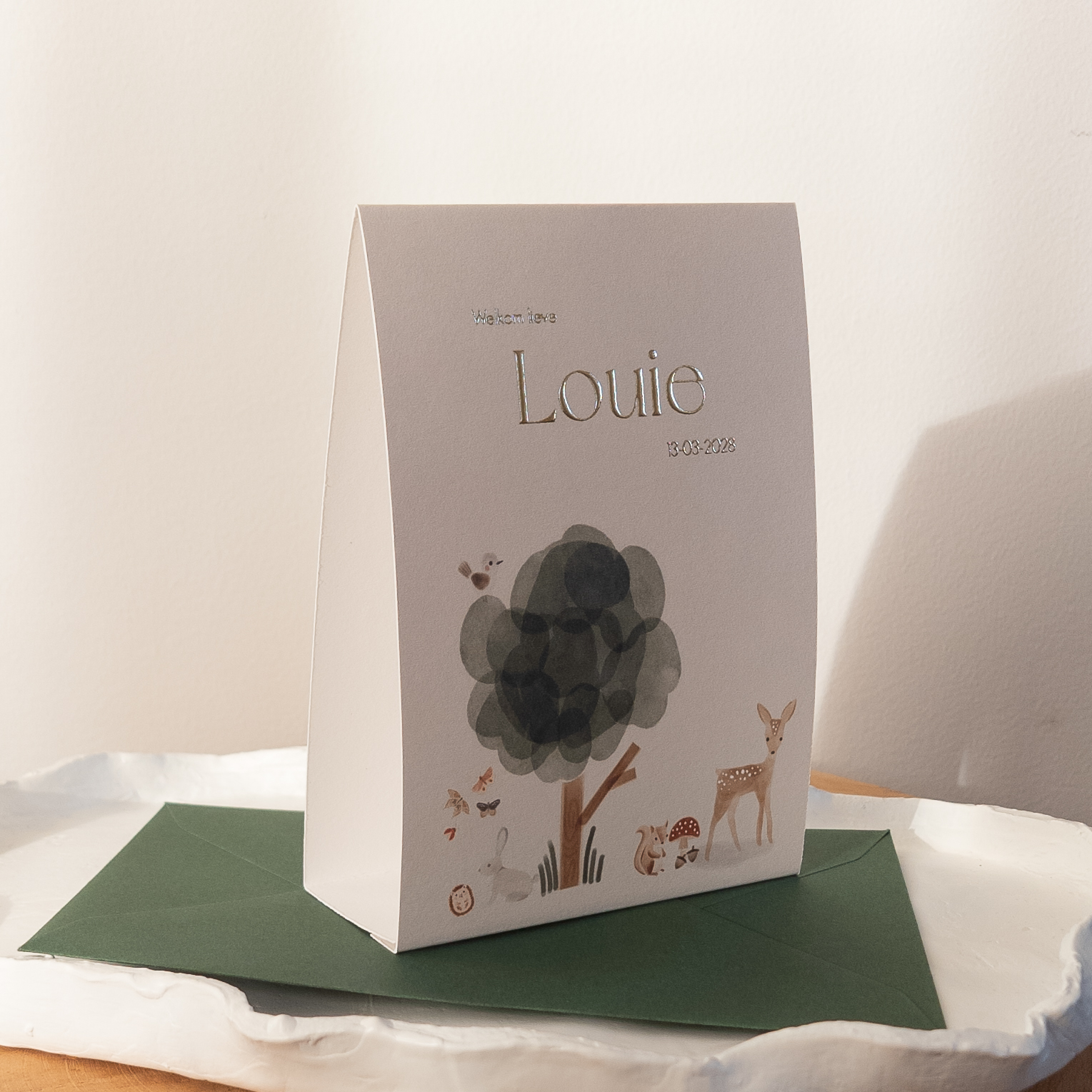 Tent geboortekaartje zand met bosdiertjes en goudfolie