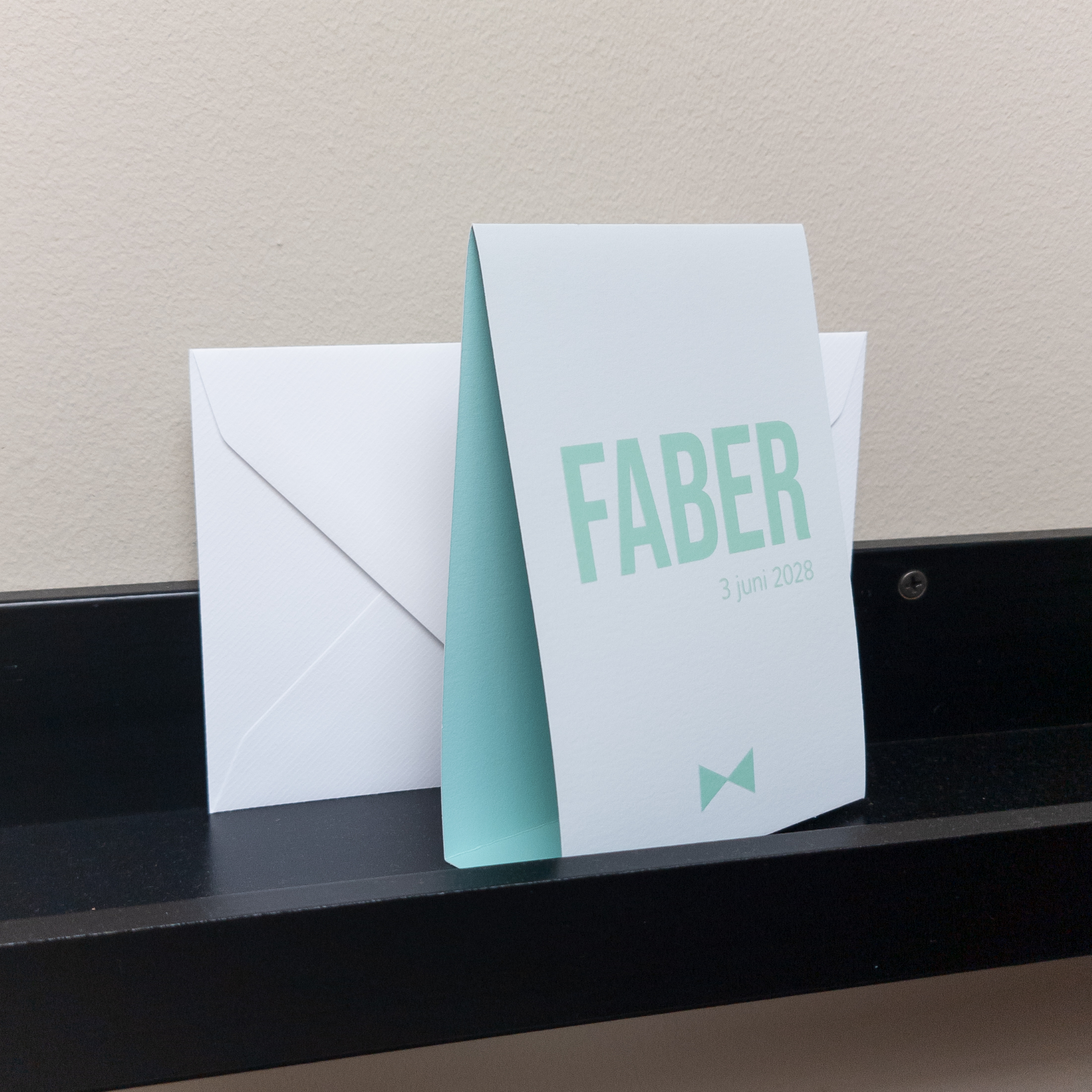 Tent geboortekaartje in zeegroen aqua tinten met UV spotlak aan de voorzijde op de naam, datum en het vlinderstrikje. Uv spotlak is als het ware een hoogglans blanke lak die eroverheen wordt aangebracht. Wil je de kaart wat zacht en pastelkleurig (zoals op het voorbeeld), bestel hem dan op linnen. Wil je levendige kleuren, bestel dan op coated karton. Het meest originele geboortekaartje voor jouw kleintje.