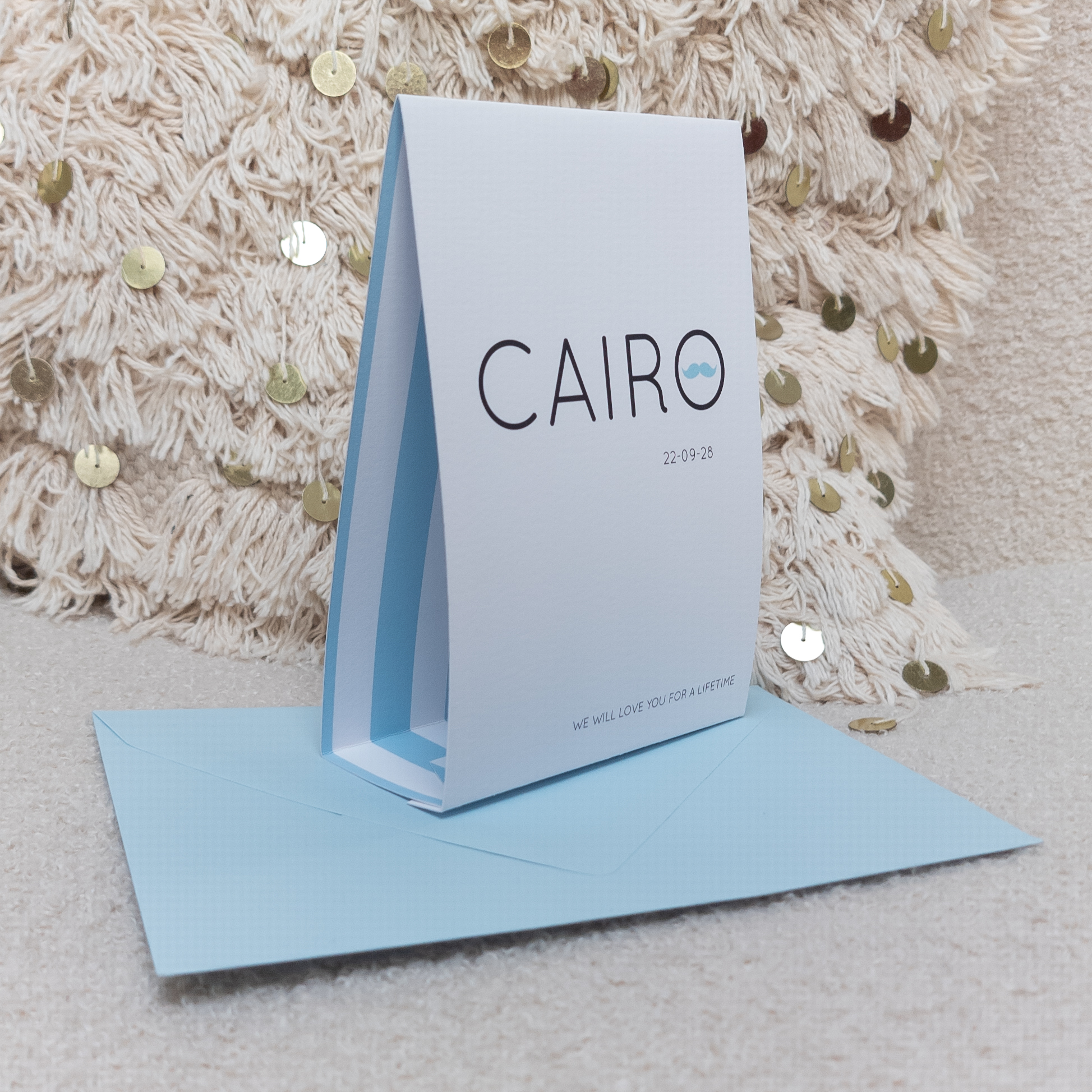Tent geboortekaartje met een blauw wit gestreepte binnenkant en eenvoudige tekst en print in zwart wit. Het voorbeeld is op linnen papier afgedrukt. Wil je wat levendigere kleuren, bestel hem dan op coated karton!