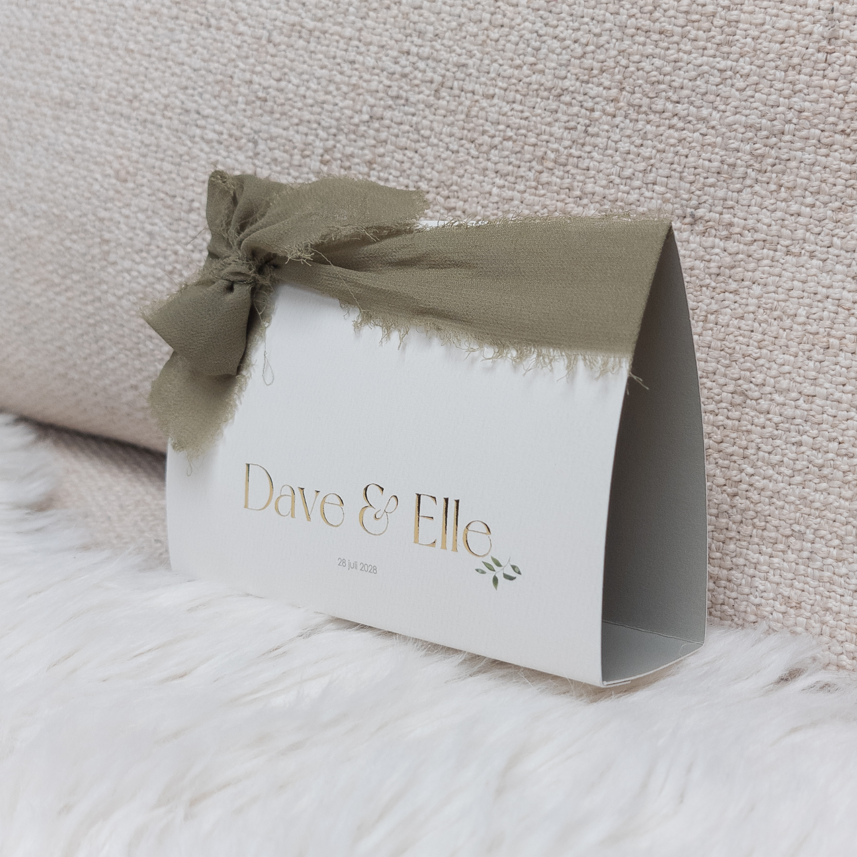 Liggende trouw tentkaart met olijfgroene details. Heel tof te combineren met ons zijden lint in olijfgroen of crème! De print van de kaart komt het mooist tot zijn recht op linnen papier en is super subtiel.