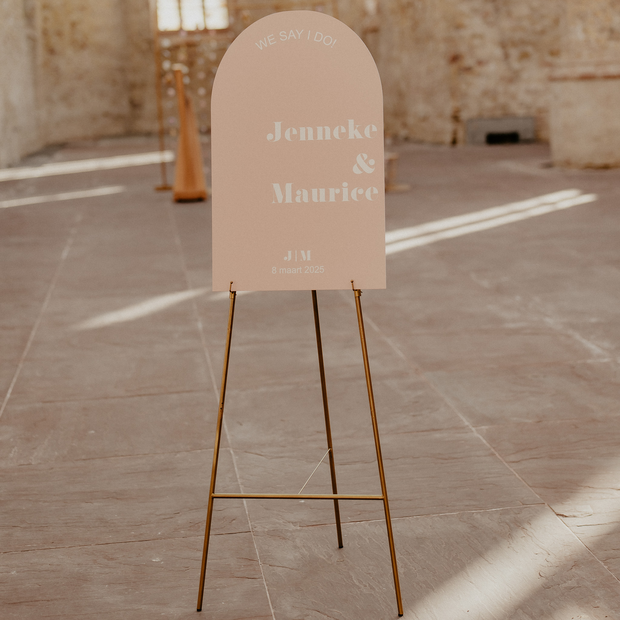 bruiloftbord boog peach pastel love heeft een afmeting van 46 bij 74 cm en past perfect bij de trouw huisstijl van Myon en Joost!