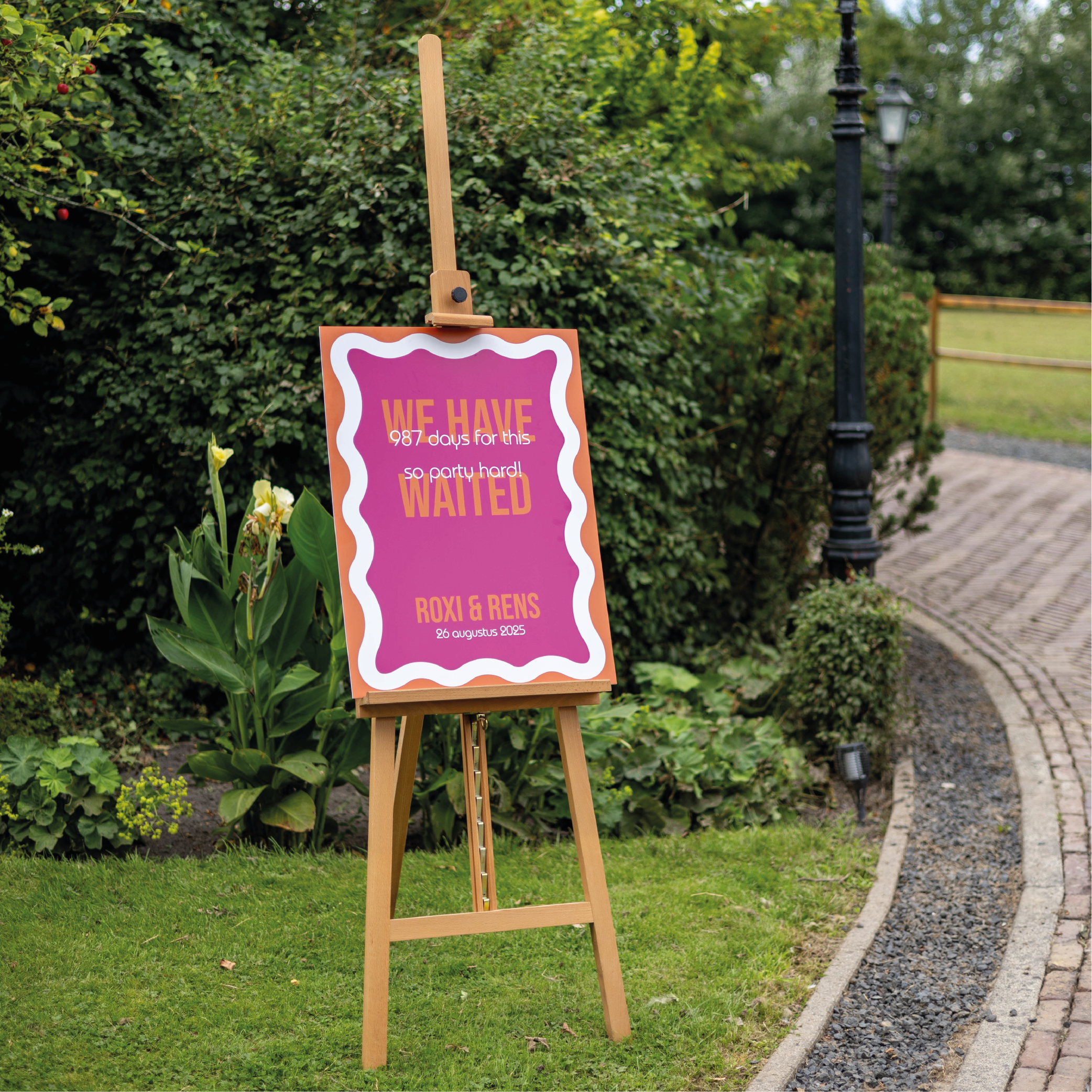 Feestelijk welkomstbord in kleurrijke stijl. De golvende vormen komen door de hele trouw huisstijl van Roxi en Rens terug! Fiesta forever