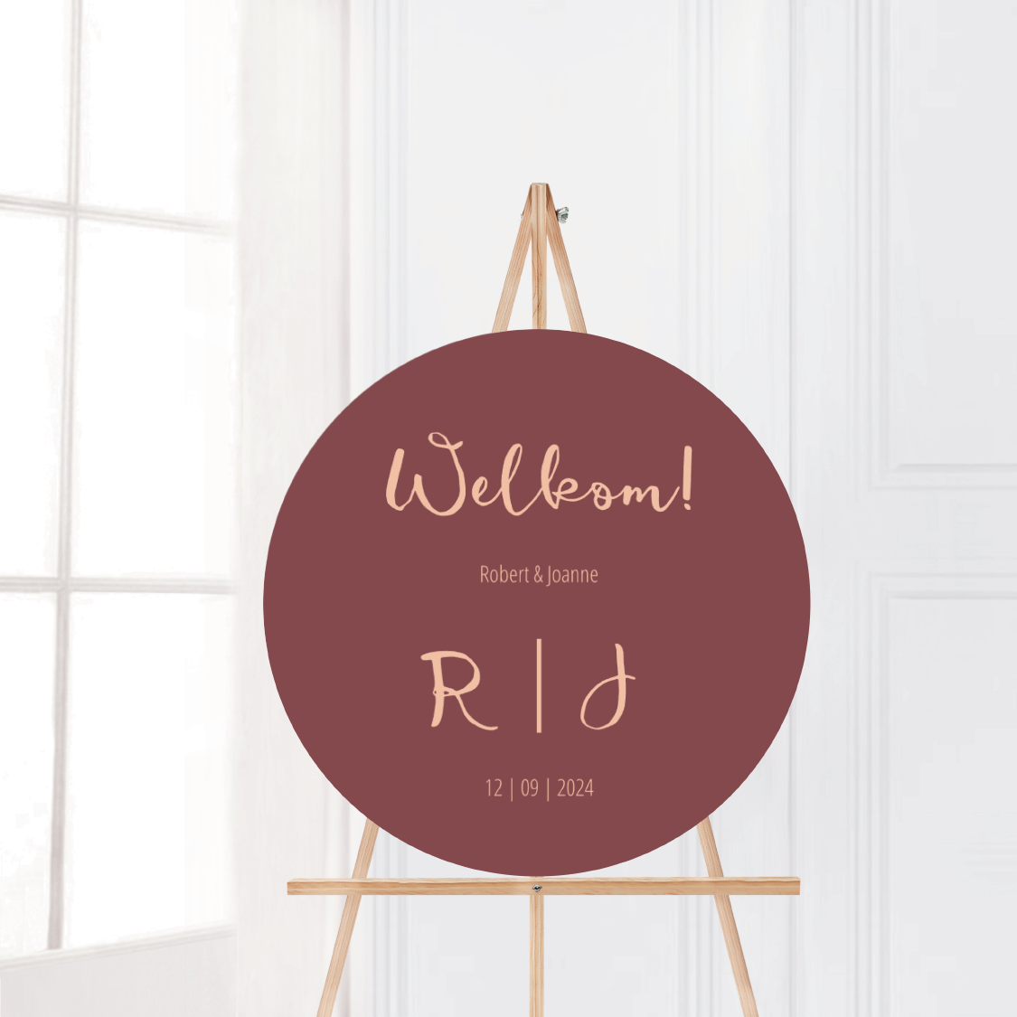 Dit bruiloftbord met een ronde vorm en een warm rode achtergrond past bij de huisstijl van Robert & Joanne. Het bord heeft een doorsnede van 80 cm.
