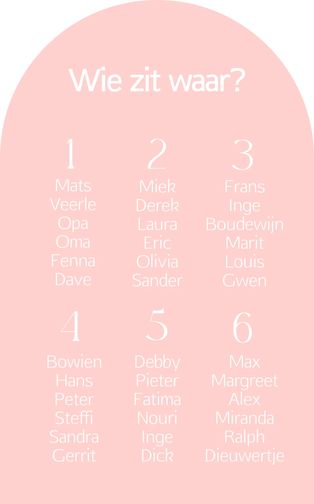 Wie zit waar? Dat noteer je op dit bord. Zet de bijbehorende tafelnummers op de tafels en je gasten zitten precies waar jullie ze bedacht hebben.