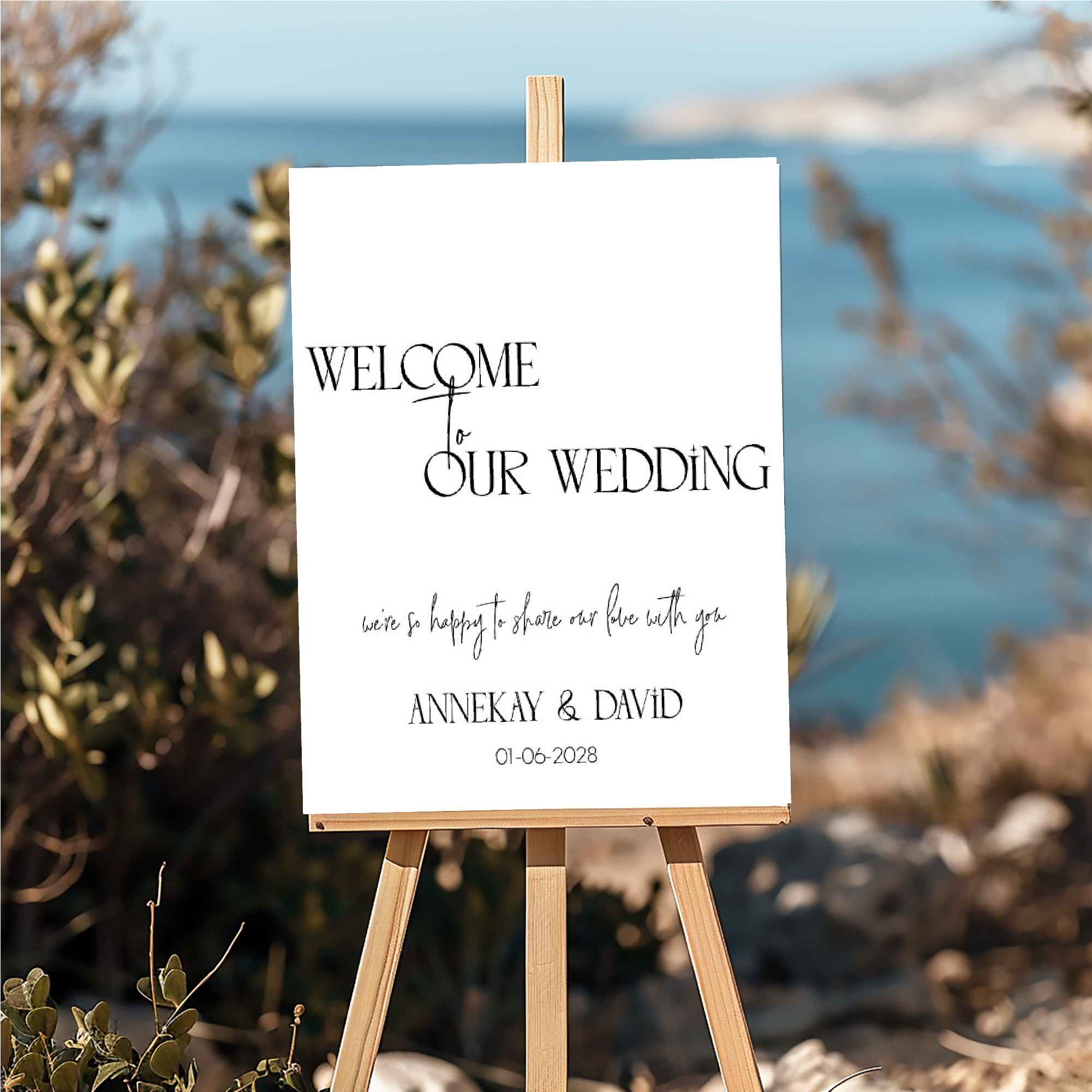 Afmeting 55x 73 cm. Op zoek naar een stijlvol welkomstbord dat perfect past bij jullie trouwhuisstijl? Dit prachtige bruiloftbord in wit en zwart is een perfecte aanvulling op jullie speciale dag.
