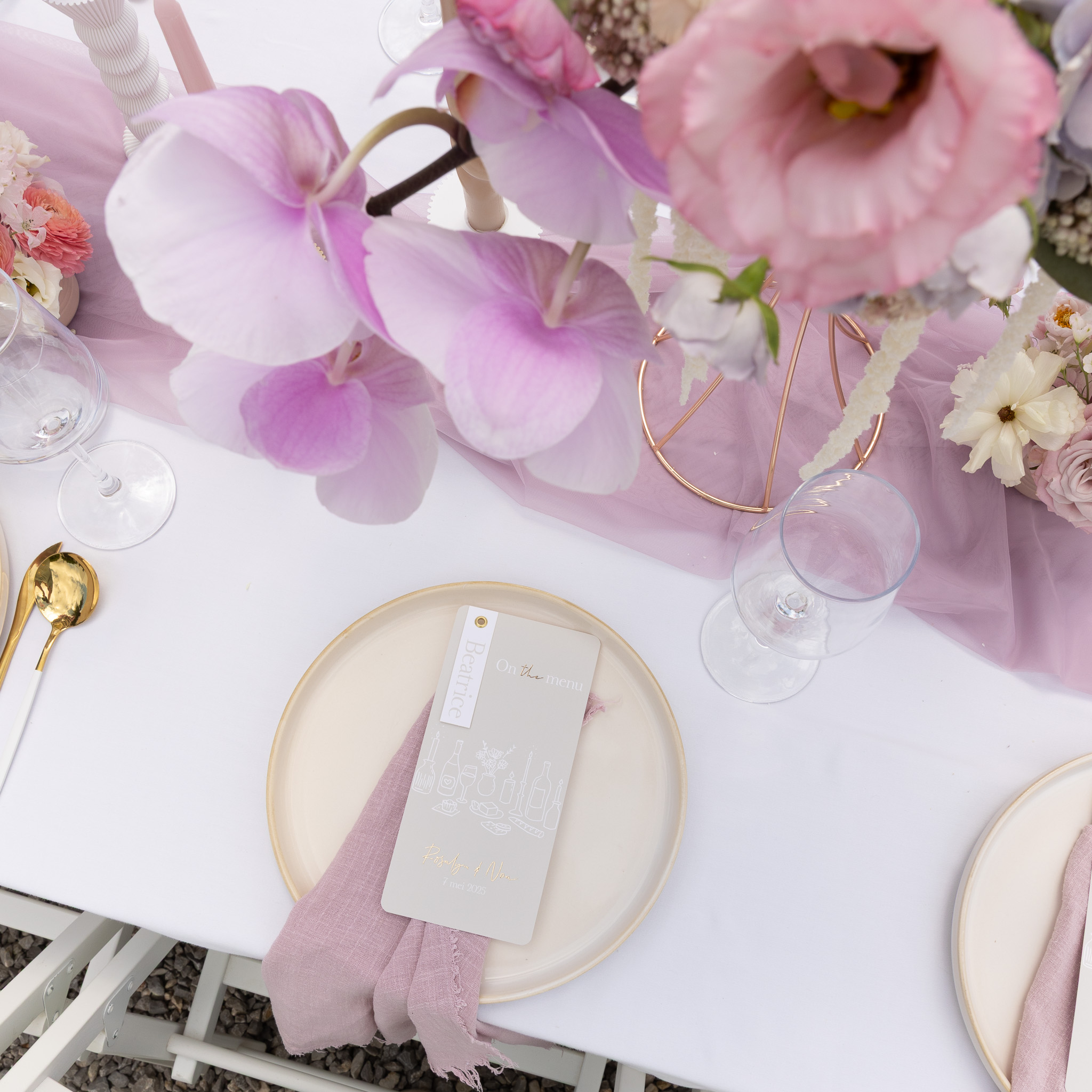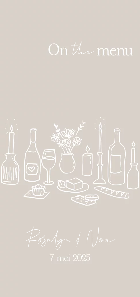 Met deze toffe menukaarten kleed jij je tafels extra mooi aan. Je gasten zullen verrast zijn om te zien dat je de hele trouw huisstijl doortrekt zodat alles perfect bij elkaar past. Formaat 10x21 cm met goudfolie en ronde hoeken. Linksboven blijft wat ruimte open om daar het wit met beige label aan te kunnen hangen. Gebruik paperclips of de flenstang met flensringetjes.