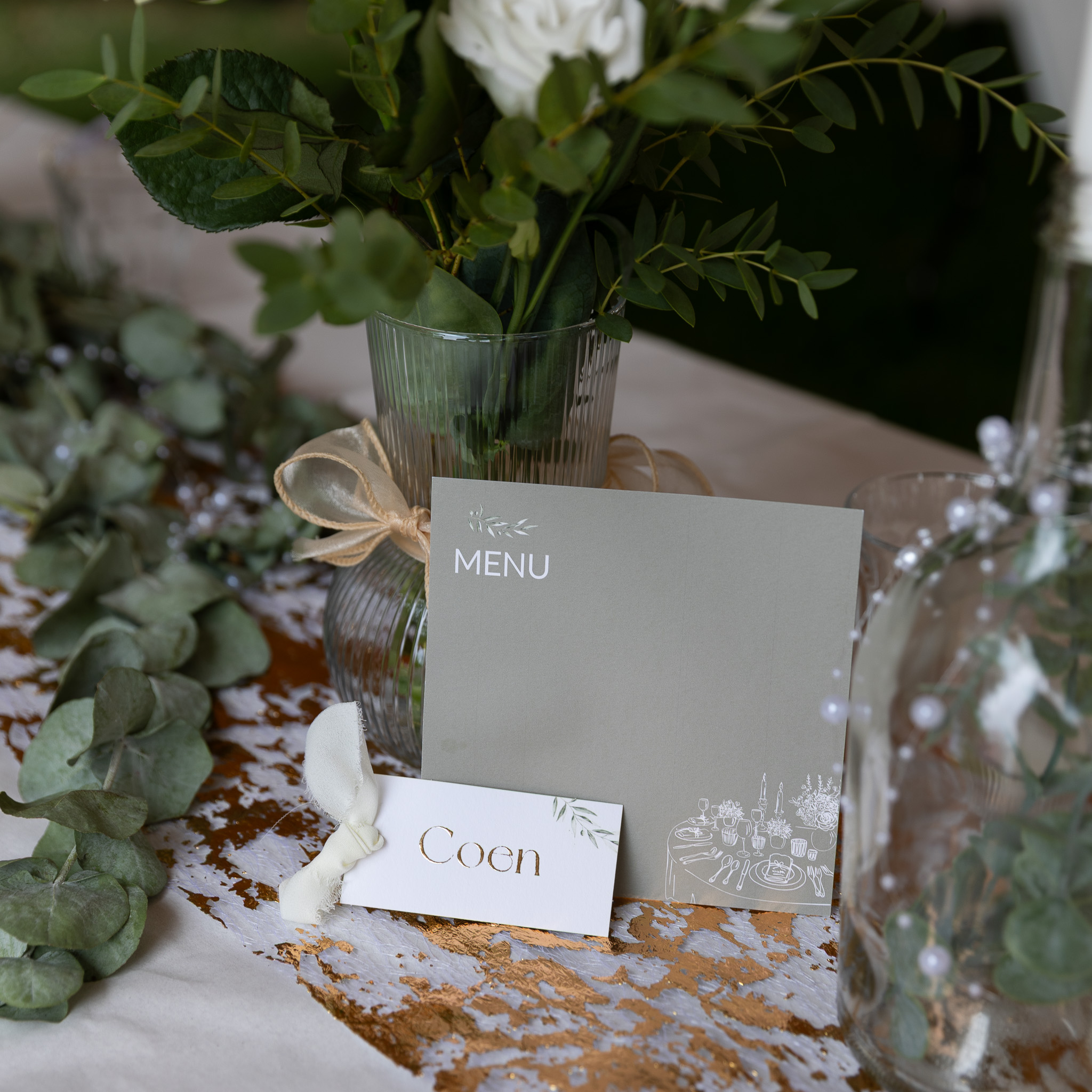 Olijfgroene menukaart met witte bedrukking. In het midden is ruimte overgelaten voor het bijpassende naamkaartje wat met goudfolie bedrukt wordt en waar je zelf nog olijfgroen of zoals in het voorbeeld, ecru lint doorheen kunt halen. De naamkaartjes bestel je er nog los bij.