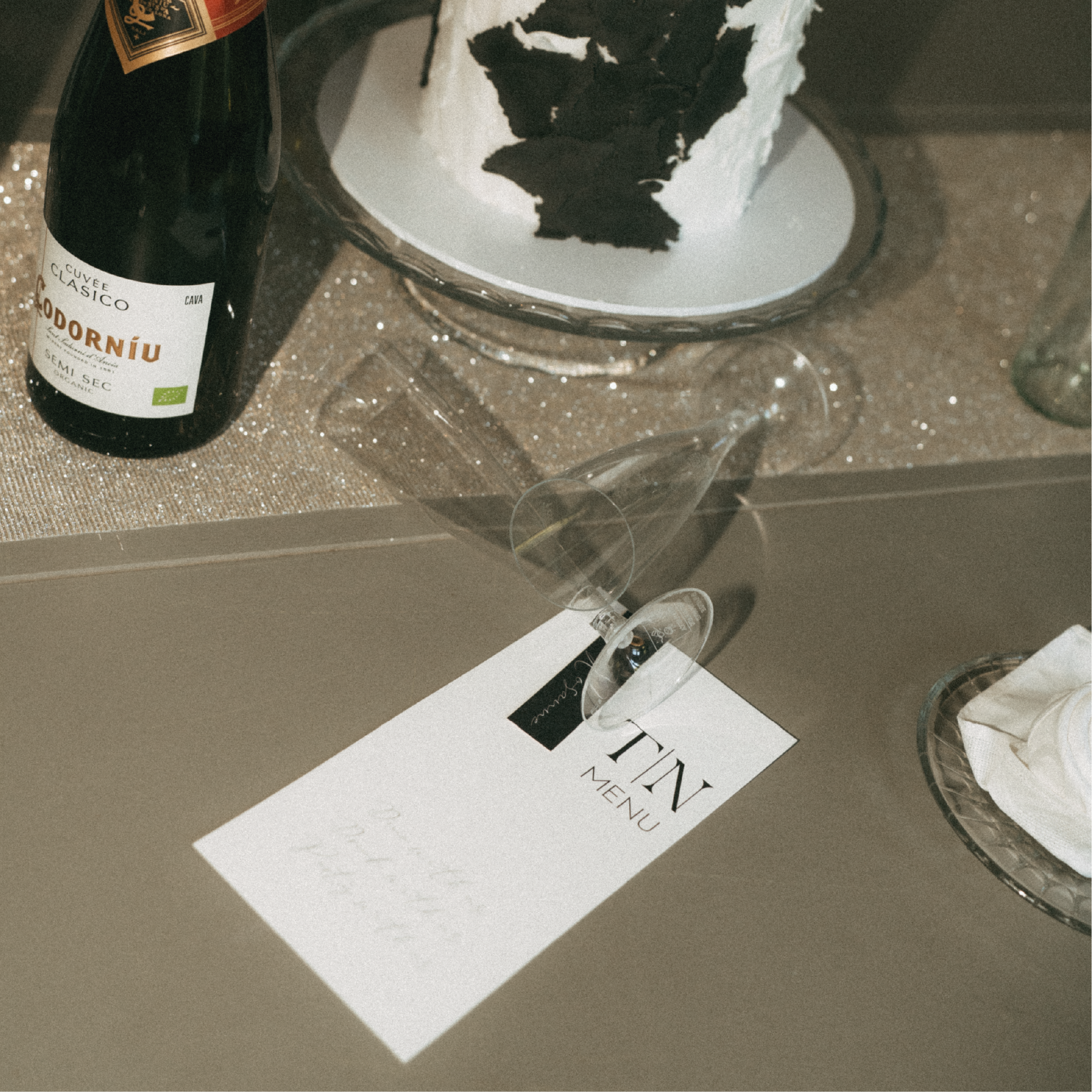 Menukaart bij wedding stationery Black and white. Wat deze menukaart afmaakt zijn de zwarte naamkaartjes die je met een apart mee te bestellen flenstang en gouden flensringetjes aan de menukaart bevestigt. Op het voorbeeld zijn beide onderdelen op linnen afgedrukt.