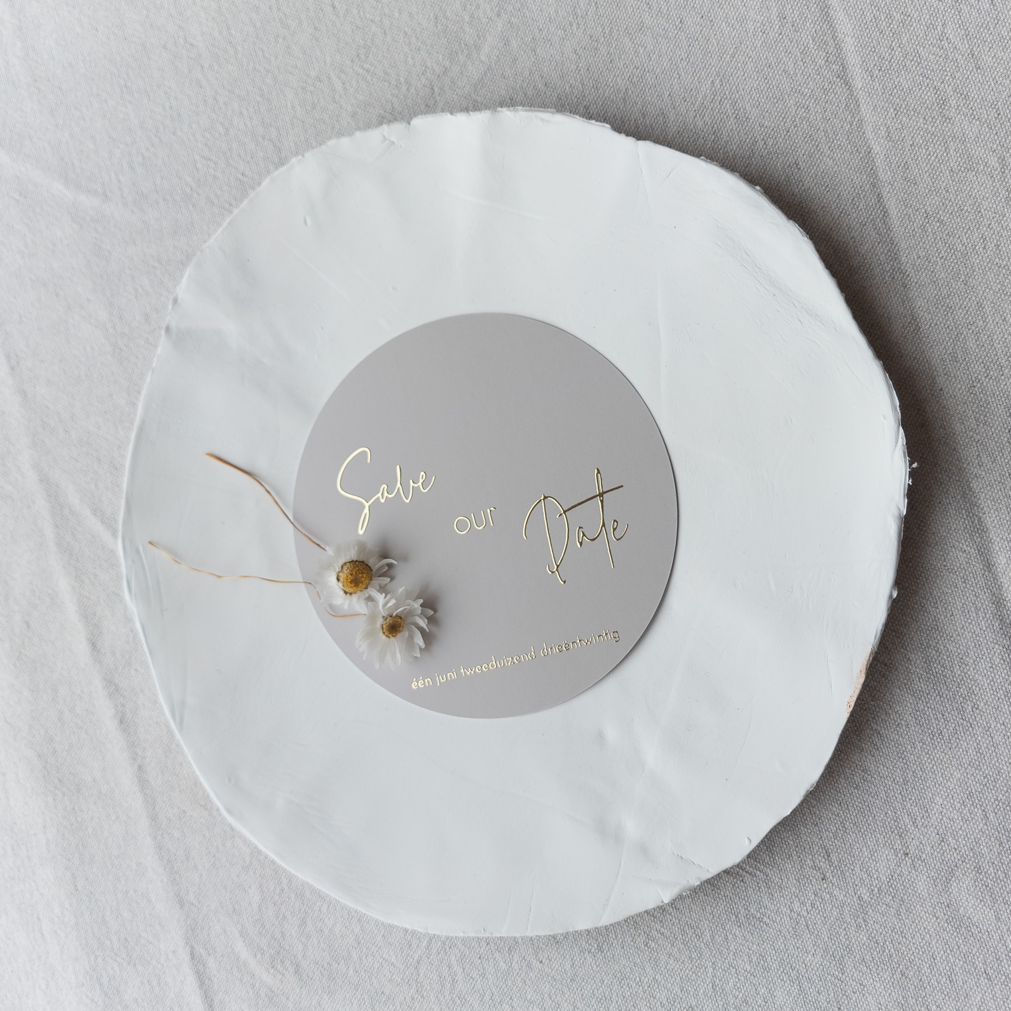 Ronde save the date kaart beige wit goudfolie