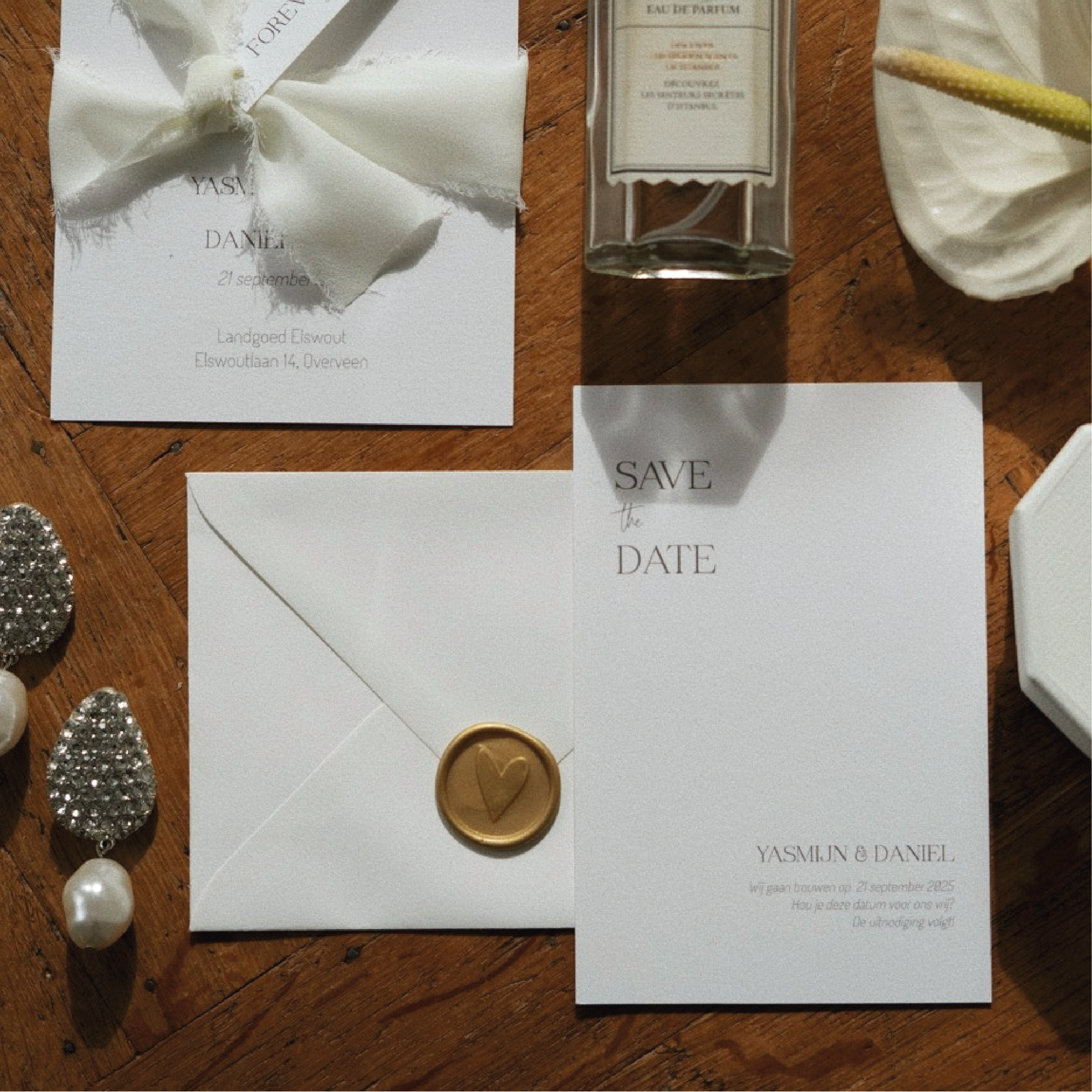 Rustige, eenvoudige en chique save the date kaart in dezelfde vormgeving als de gehele trouw huisstijl Better together van Yasmijn en Daniel.
